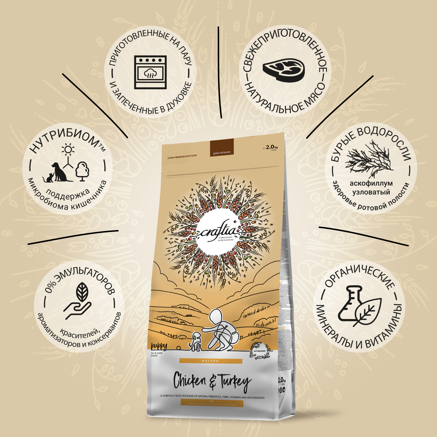 Сухой корм CRAFTIA NATURA для щенков миниатюрных и мелких пород из курицы и индейки 2 кг