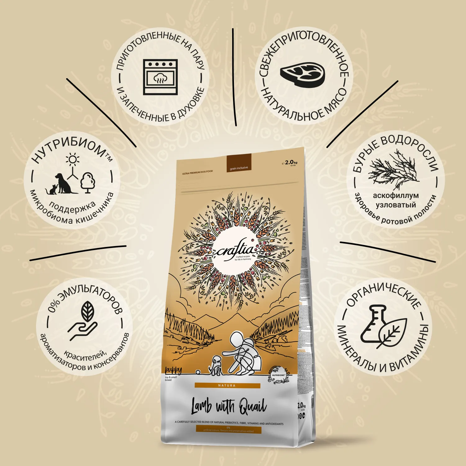 CRAFTIA NATURA сухой корм для щенков миниатюрных и мелких пород из ягненка с перепелкой.