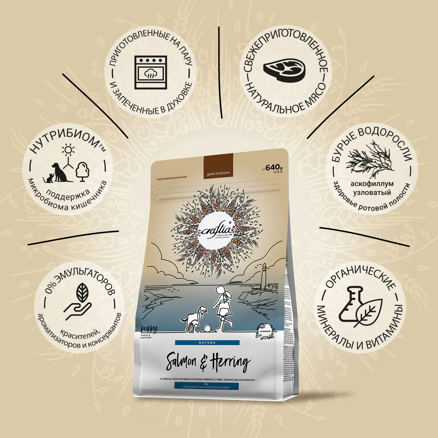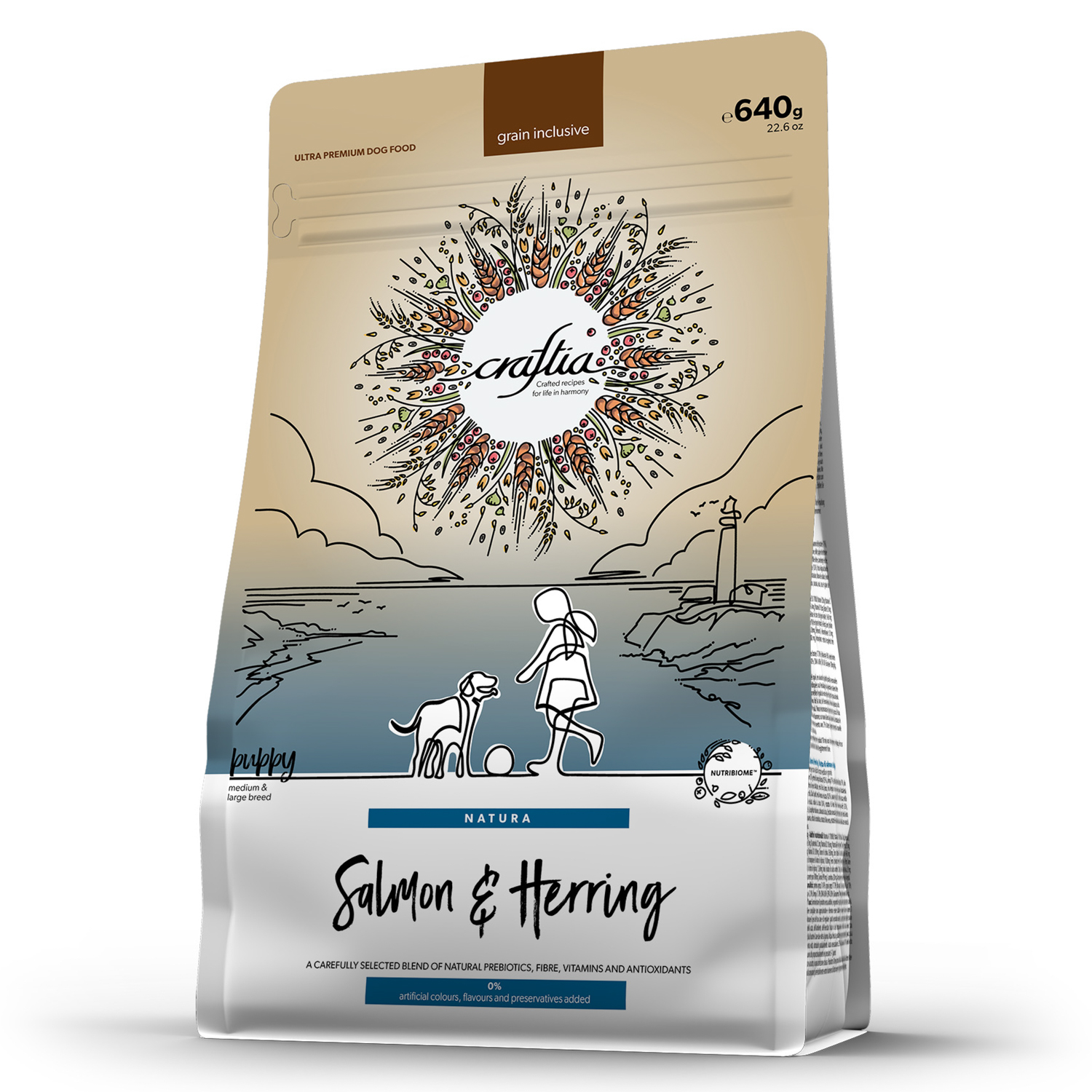 Сухой корм CRAFTIA NATURA для щенков средних и крупных пород из лосося и сельди 640 г