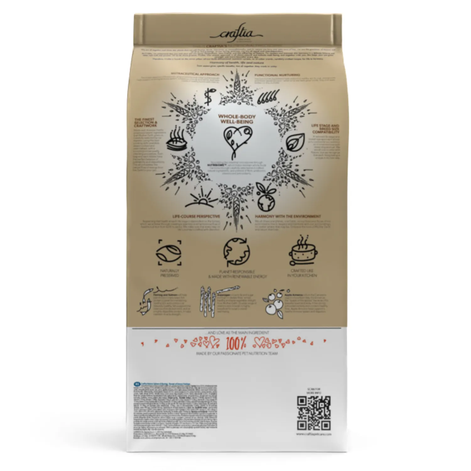 Состав кормов CRAFTIA прозрачен и понятен, отсутствуют скрытые добавки и сомнительные ингредиенты. Все, что заявлено в составе корма, гарантированно присутствует в каждой грануле. Собственный завод, сотни квадратных метров научно-исследовательских лабораторий, первоклассное сырье — все это позволяет создавать тщательно сбалансированный высокобелковый корм с холистическим подходом. Все компоненты корма подходят для употребления человеком и не содержат ГМО.