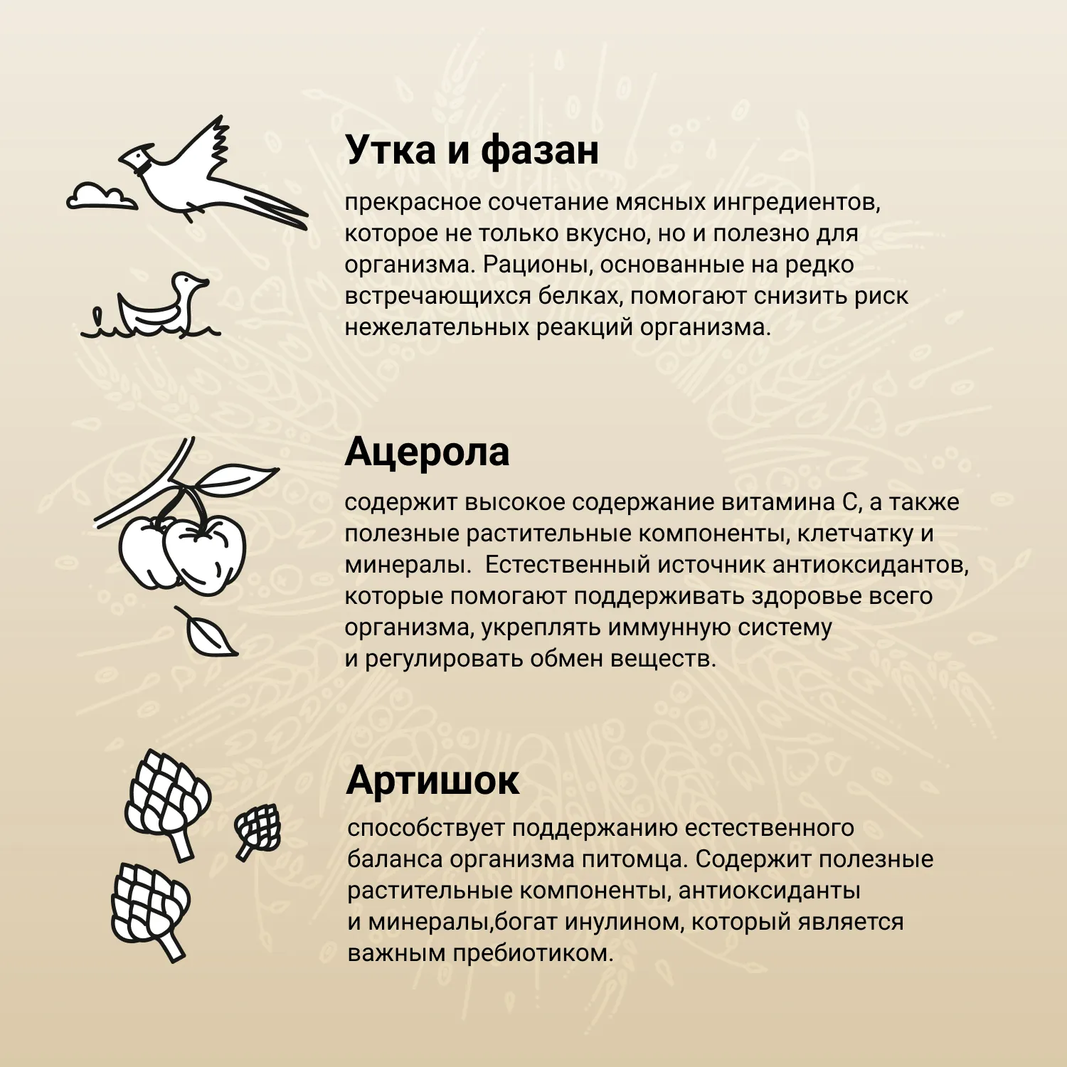 Основные источники белка в корме — свежее мясо утки и фазана. Это редко встречающиеся ингредиенты, которые отлично подходят животным, склонным к возникновению аллергических реакций. Утка и фазан богаты белками, поэтому они легко усваиваются и являются отличными источниками незаменимых аминокислот, витаминов и минералов.