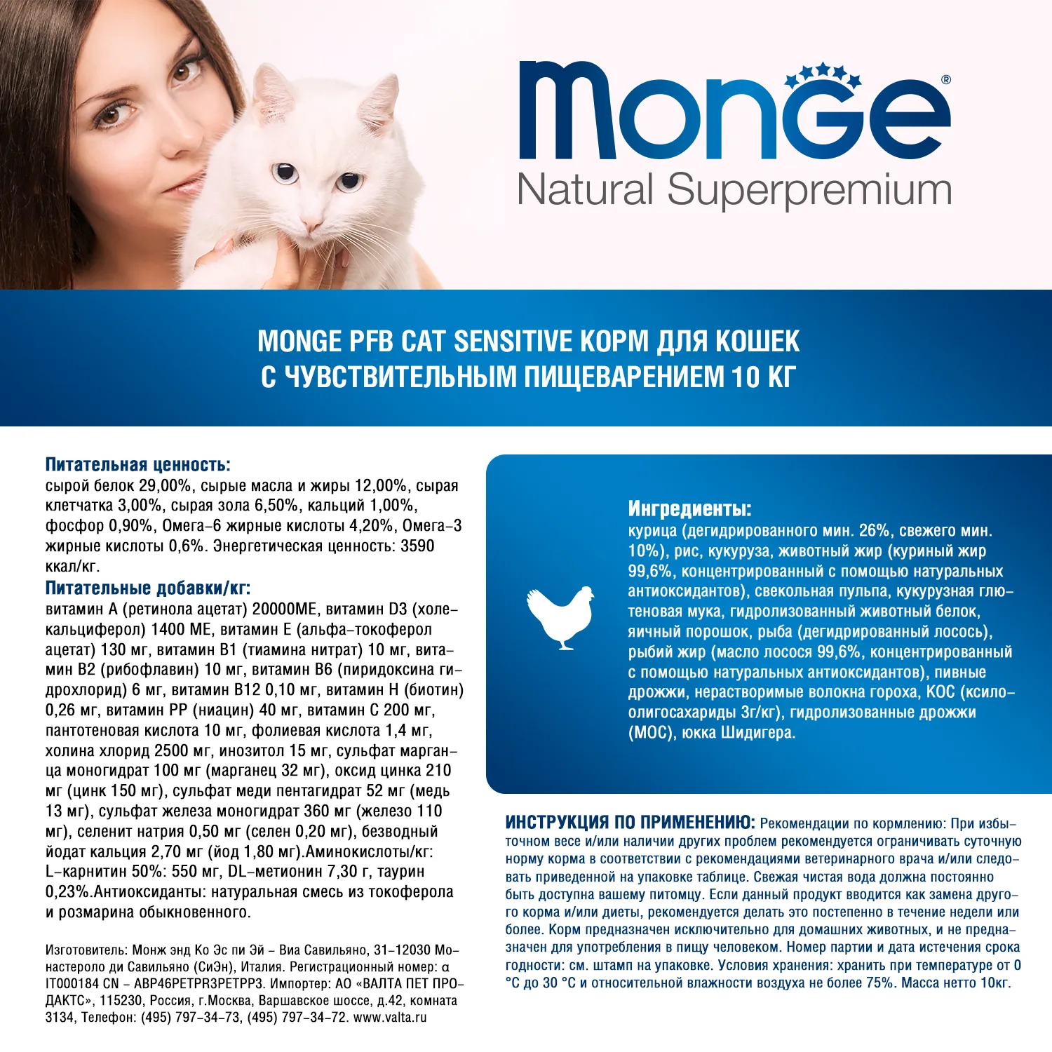 Сухой корм Monge Cat PFB Sensitive для кошек, с чувствительным пищеварением, из курицы 10 кг