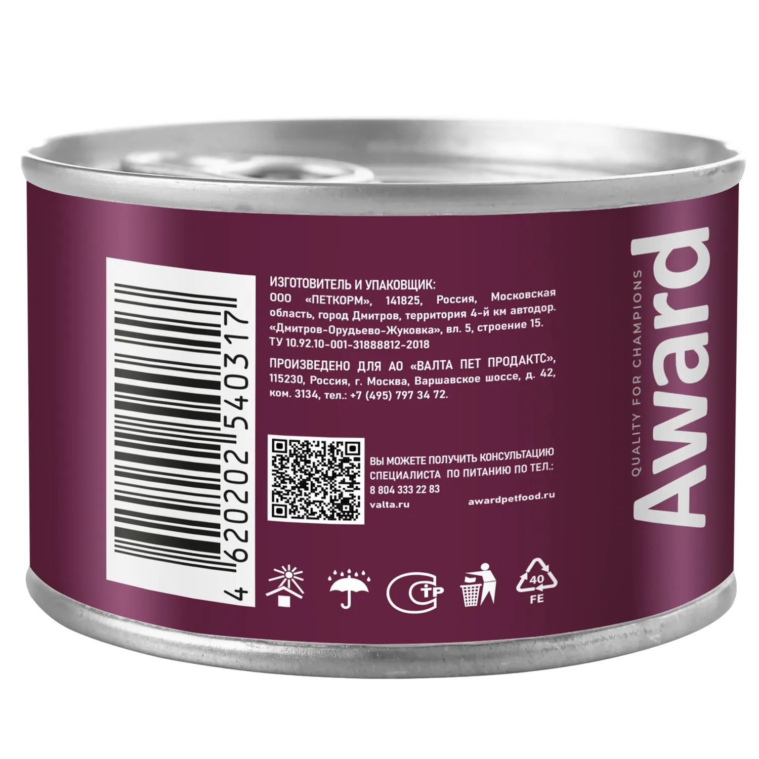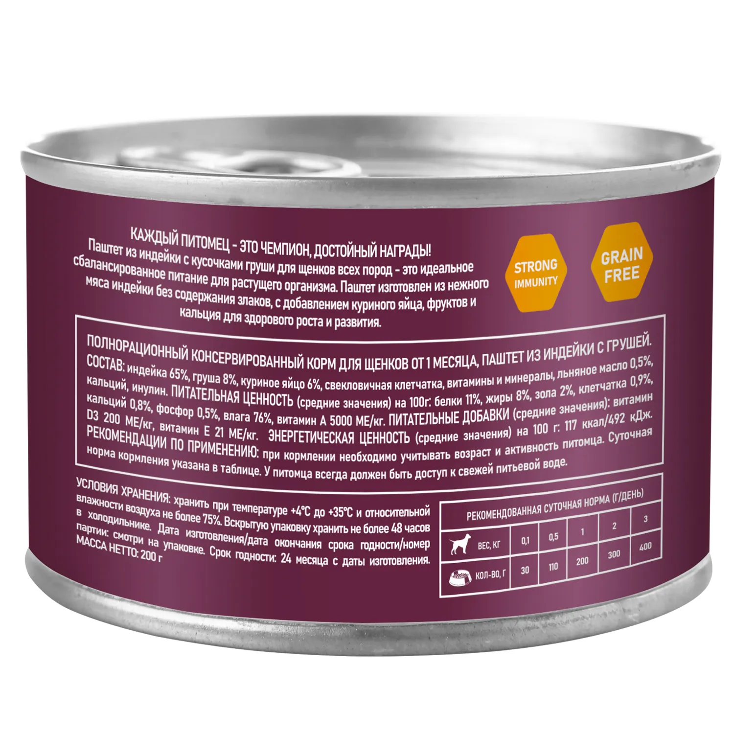Состав: индейка 65%, груша 8%, яйца кур 6%, свекловичная клетчатка, витамины и минералы, льняное масло 0,5%, кальций, инулин.