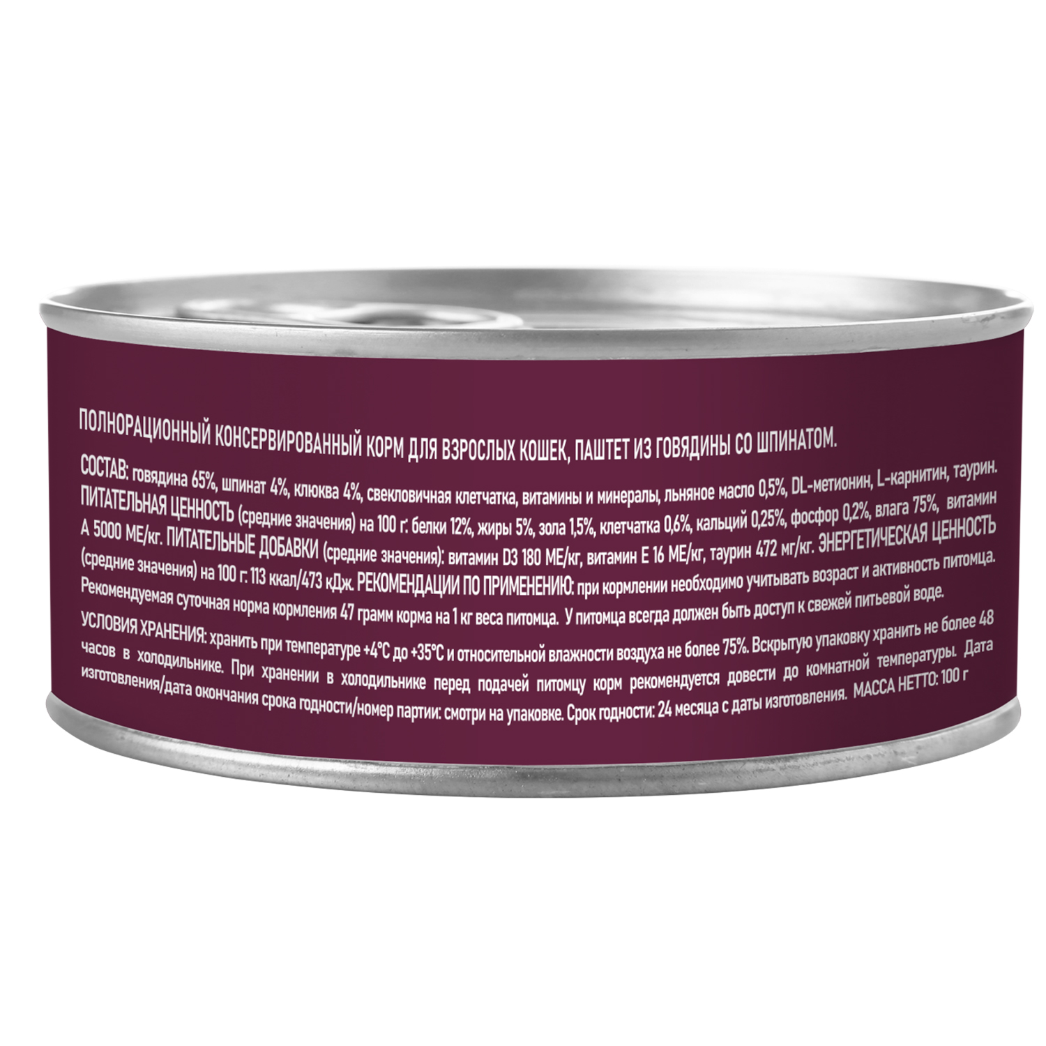 Паштет из говядины с кусочками шпината для взрослых кошек - это монопротеиновое сбалансированное питание для любимого питомца, изготовленое из одного вида мясного белка без содержания зерна и глютена, с добавлением овощей и фруктов богатых витаминами и минералами.