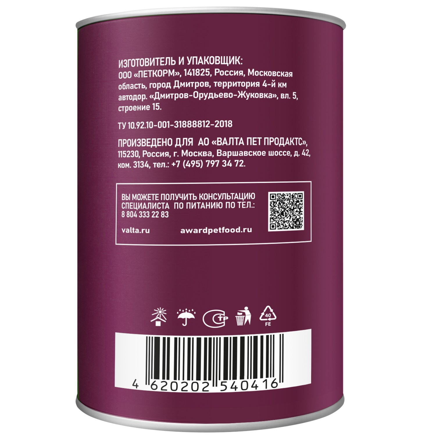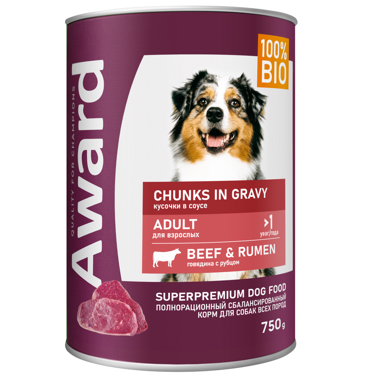 Влажный корм AWARD для взрослых собак кусочки с говядиной и рубцом в соусе 750г