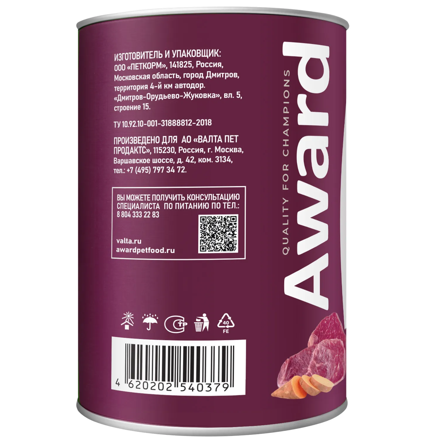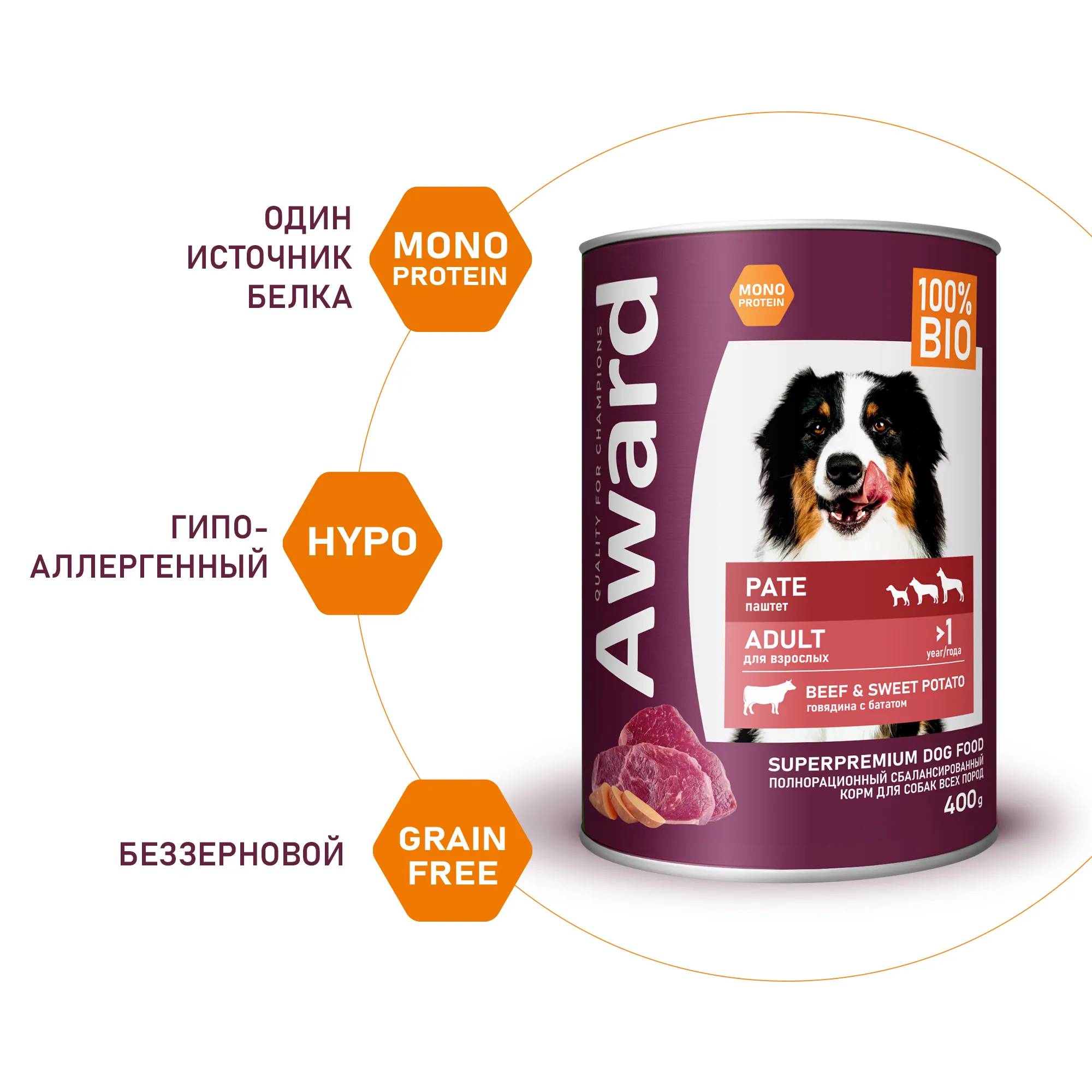 Влажный корм AWARD для взрослых собак паштет из говядины с бататом 400г