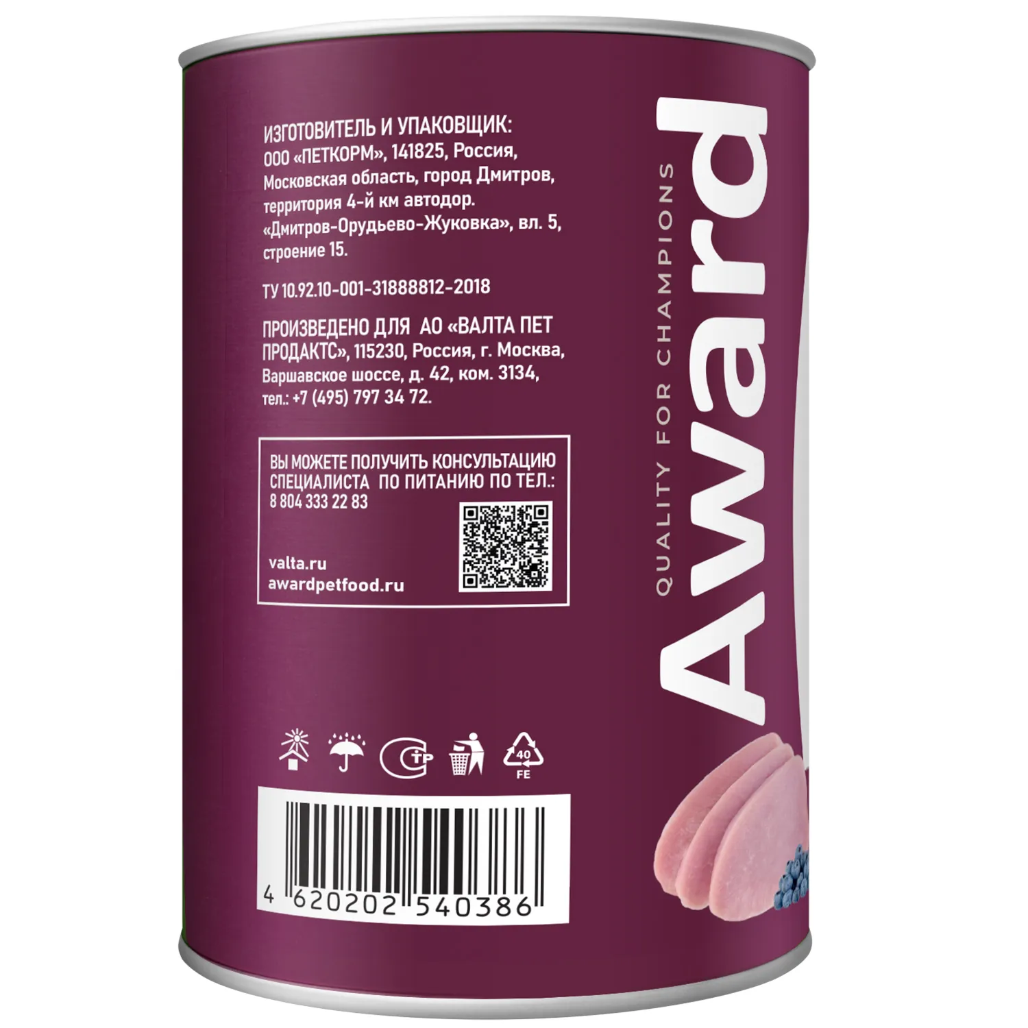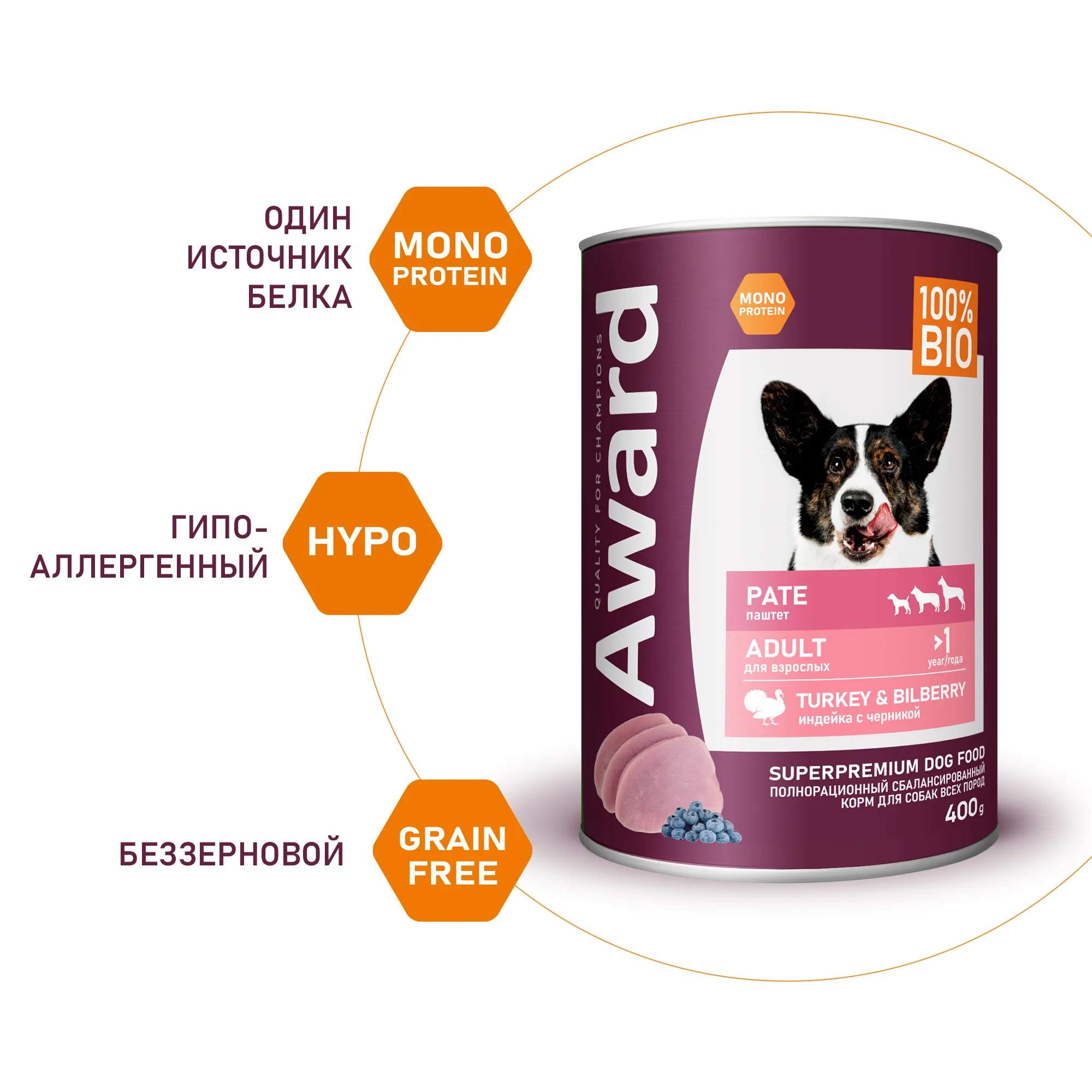 Влажный корм AWARD для взрослых собак паштет из индейки с черникой 400г