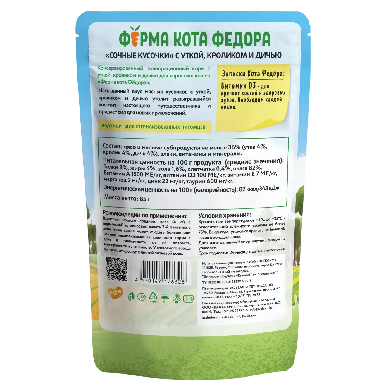 Влажный корм Ферма кота Фёдора мясные кусочки для кошек с уткой, кроликом и дичью 85г