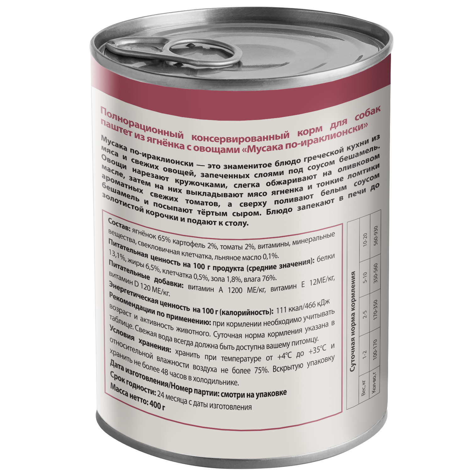 Полнорационный консервированный корм для собак всех пород "Мусака по-ираклионски". Паштет из ягнёнка с овощами.