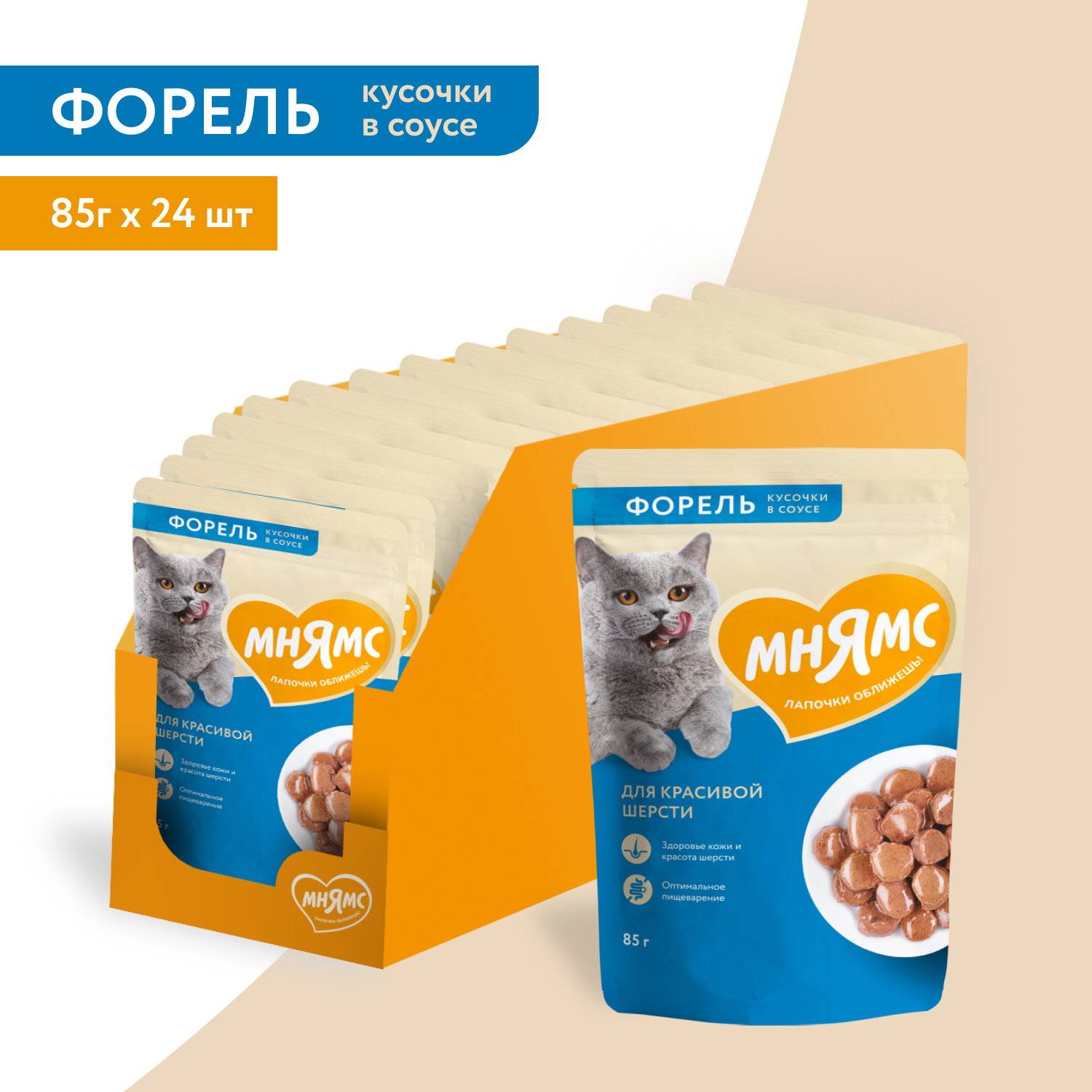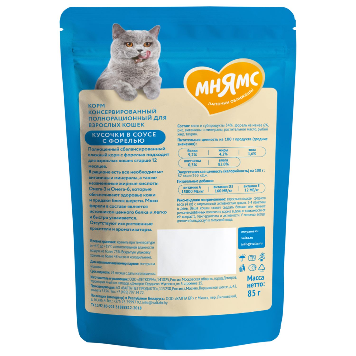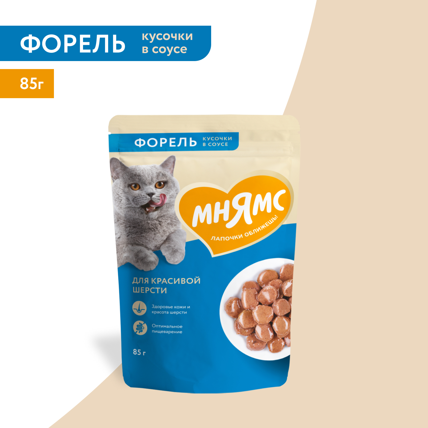 Влажный корм Мнямс На каждый день Кусочки в соусе с форелью для красивой шерсти кошек 85 г