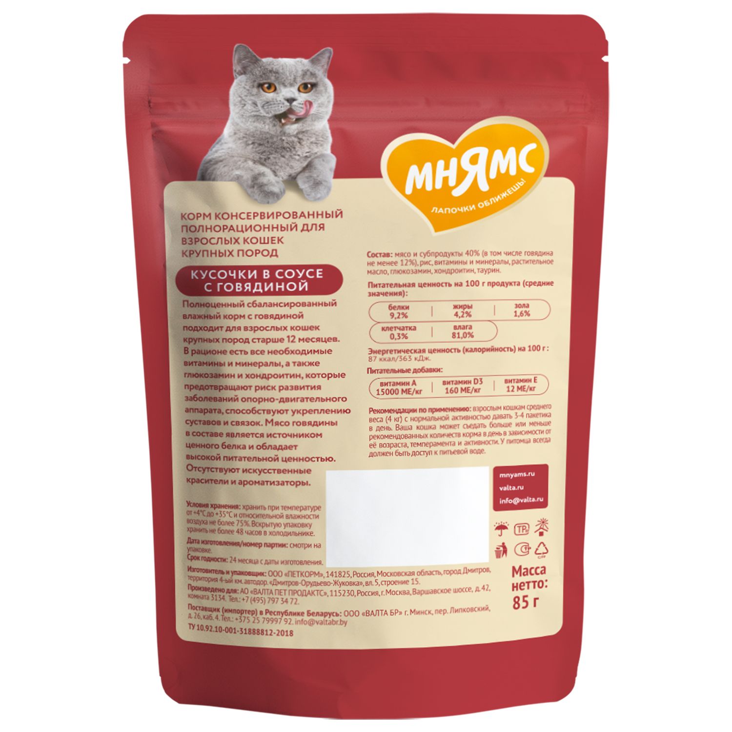 Влажный корм Мнямс На каждый день Кусочки в соусе с говядиной для крупных кошек 85 г