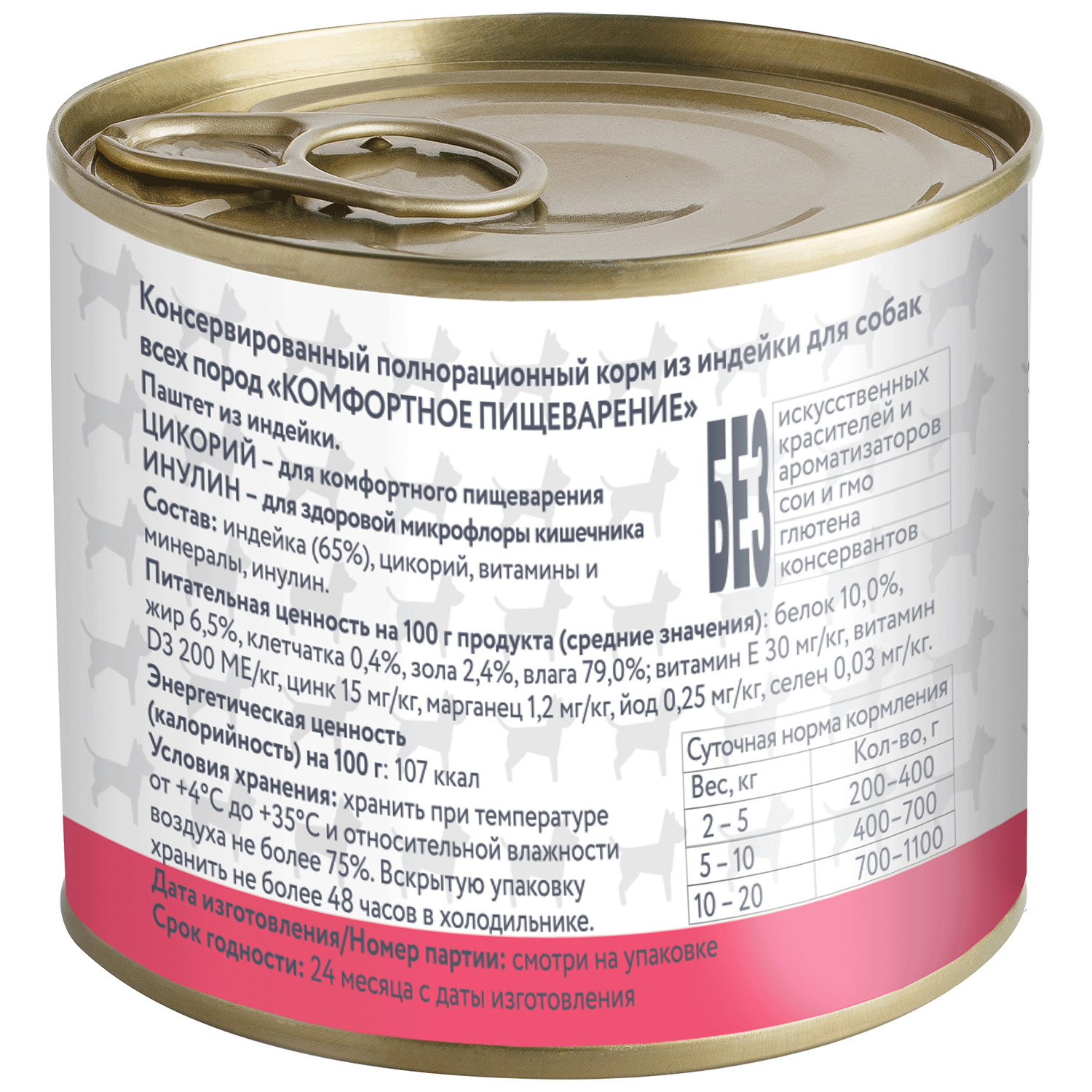 для собаки весом 2-5 кг, требуется 200 - 400г в день. для собаки весом 5-10кг, требуется 400-700 г в день. для взрослой собаки весом 10-20 кг, требуется 700-1100 г в день. Ваша собака может съедать больше или меньше рекомендованных количеств корма в день, в зависимости от её возраста, темперамента и активности. У животного всегда должен быть доступ к чистой питьевой воде.