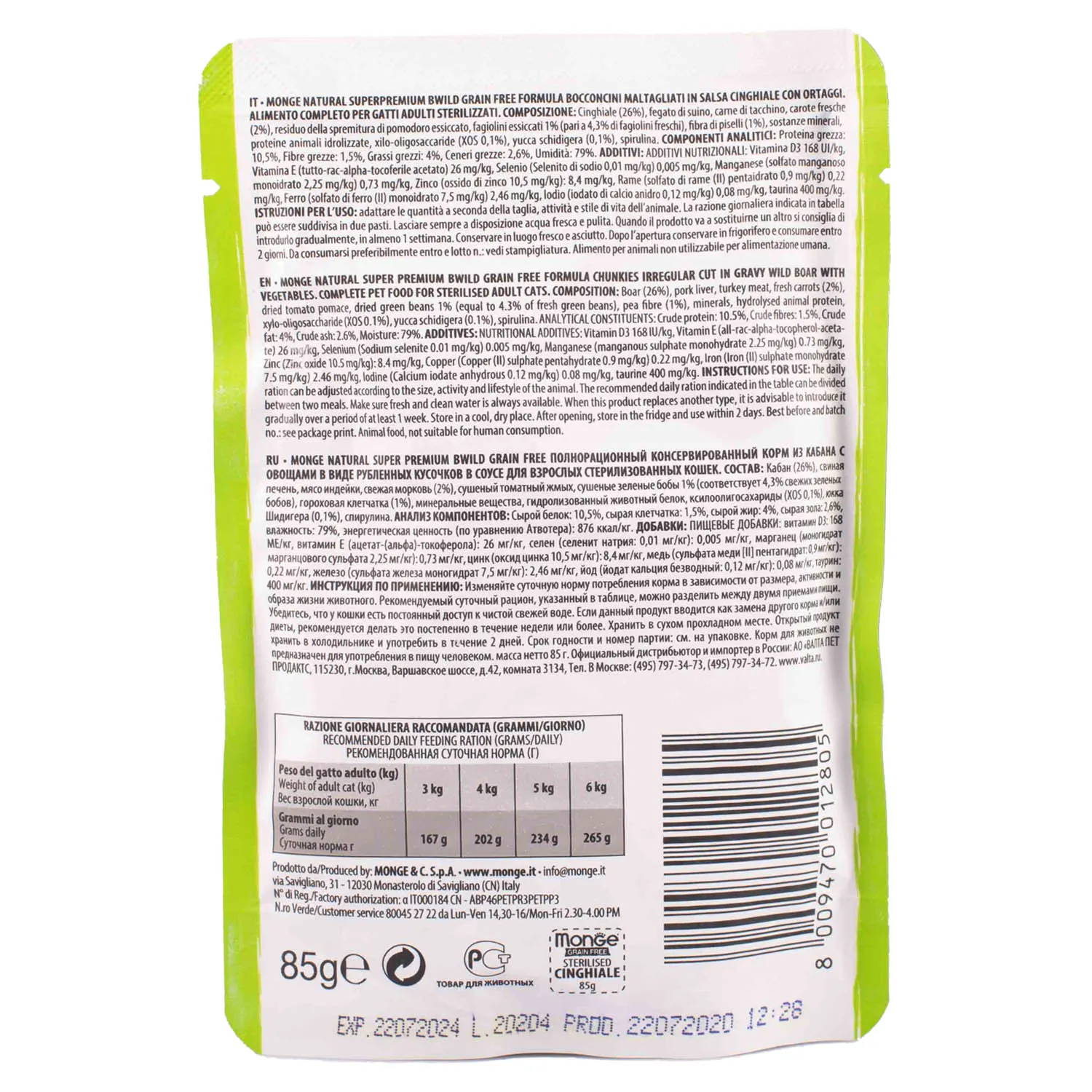 Влажный корм Monge Cat BWild GRAIN FREE для стерилизованных кошек, беззерновой, из мяса дикого кабана с овощами, паучи 85 г