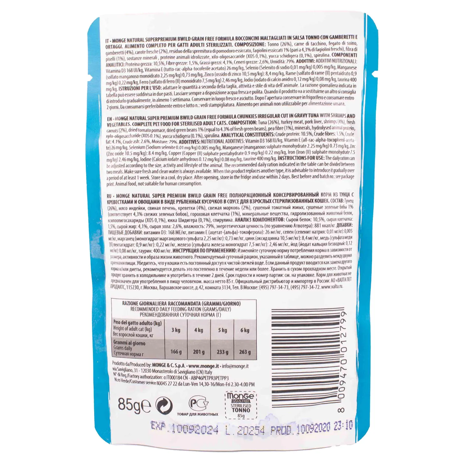 Monge (Монж) Cat BWild GRAIN FREE (холистик) полнорационные беззерновые паучи из тунца с креветками и овощами для стерилизованных кошек и кастрированных котов 85 г.