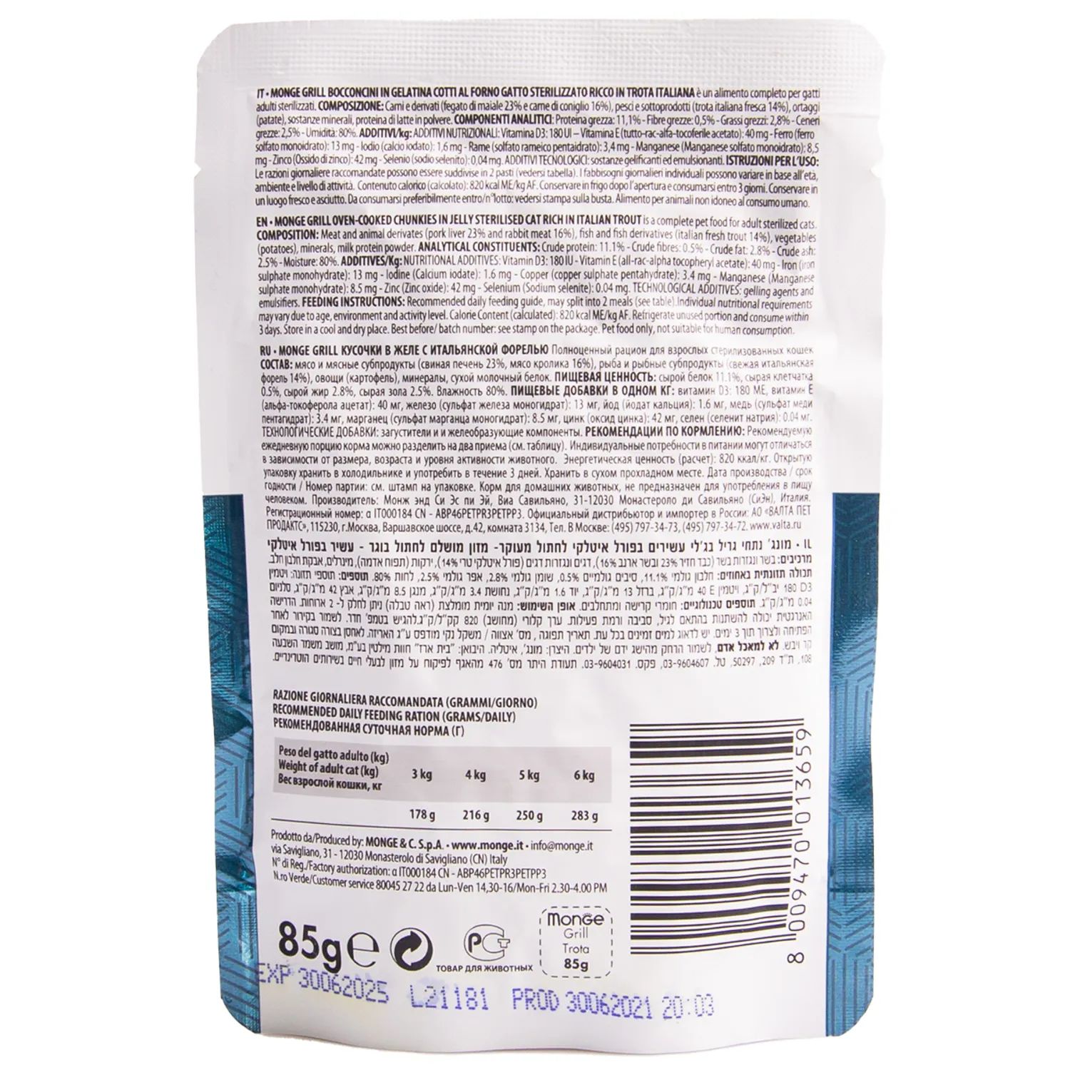 Monge (Монж) Cat Grill полнорационные беззерновые паучи с итальянской форелью для стерилизованных кошек и кастрированных котов 85 г.