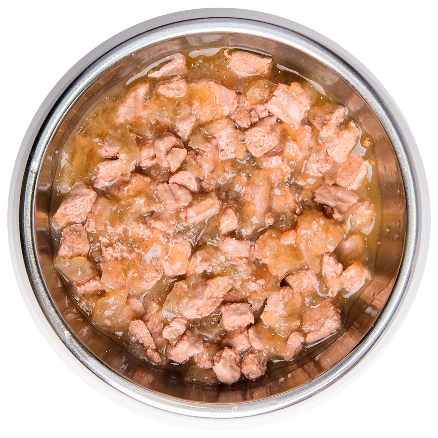 Мясо и мясные субпродукты (свежее мясо итальянской курицы 20%, мясо кролика 20%), рыба и рыбные субпродукты, овощи (картофель), минералы, сухой молочный белок.Питательная ценность: сырой белок 11.5%, сырая клетчатка 0.5%, сырой жир 2.4%, сырая зола 2.4%, влага 80%.