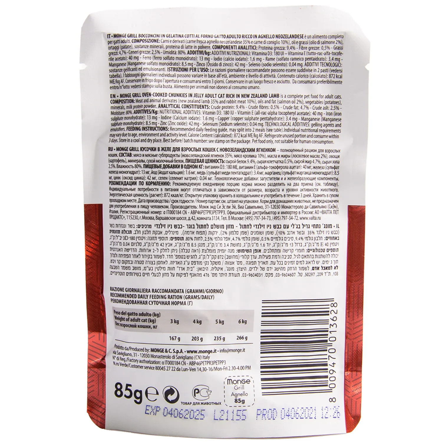 Влажный корм Monge Cat Grill для взрослых кошек, из новозеландского ягненка, паучи 85 г