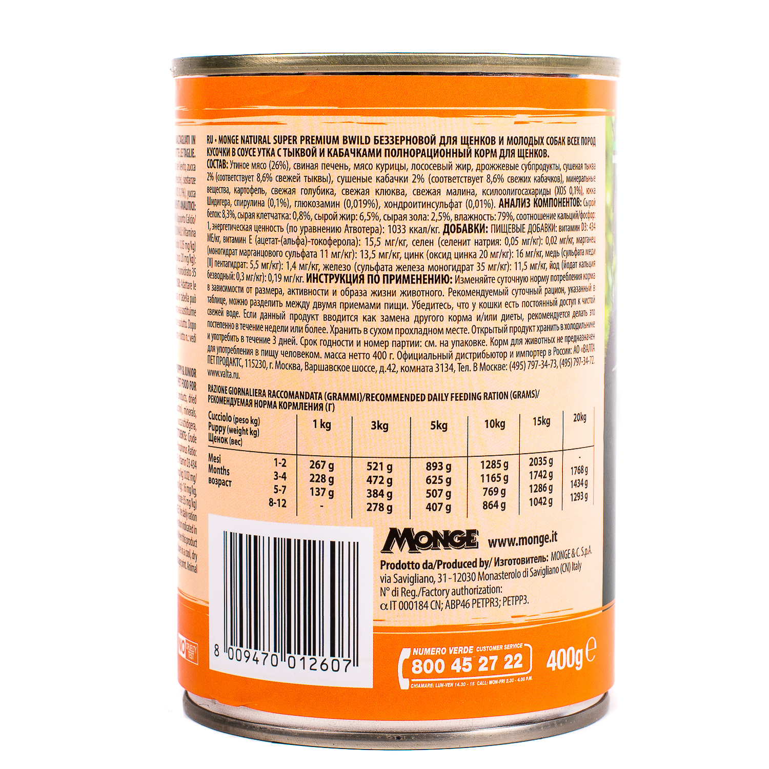 Влажный корм Monge Dog BWild GRAIN FREE Puppy&Junior для щенков и беременных собак, беззерновой, из утки с тыквой и кабачками, консервы 400 г