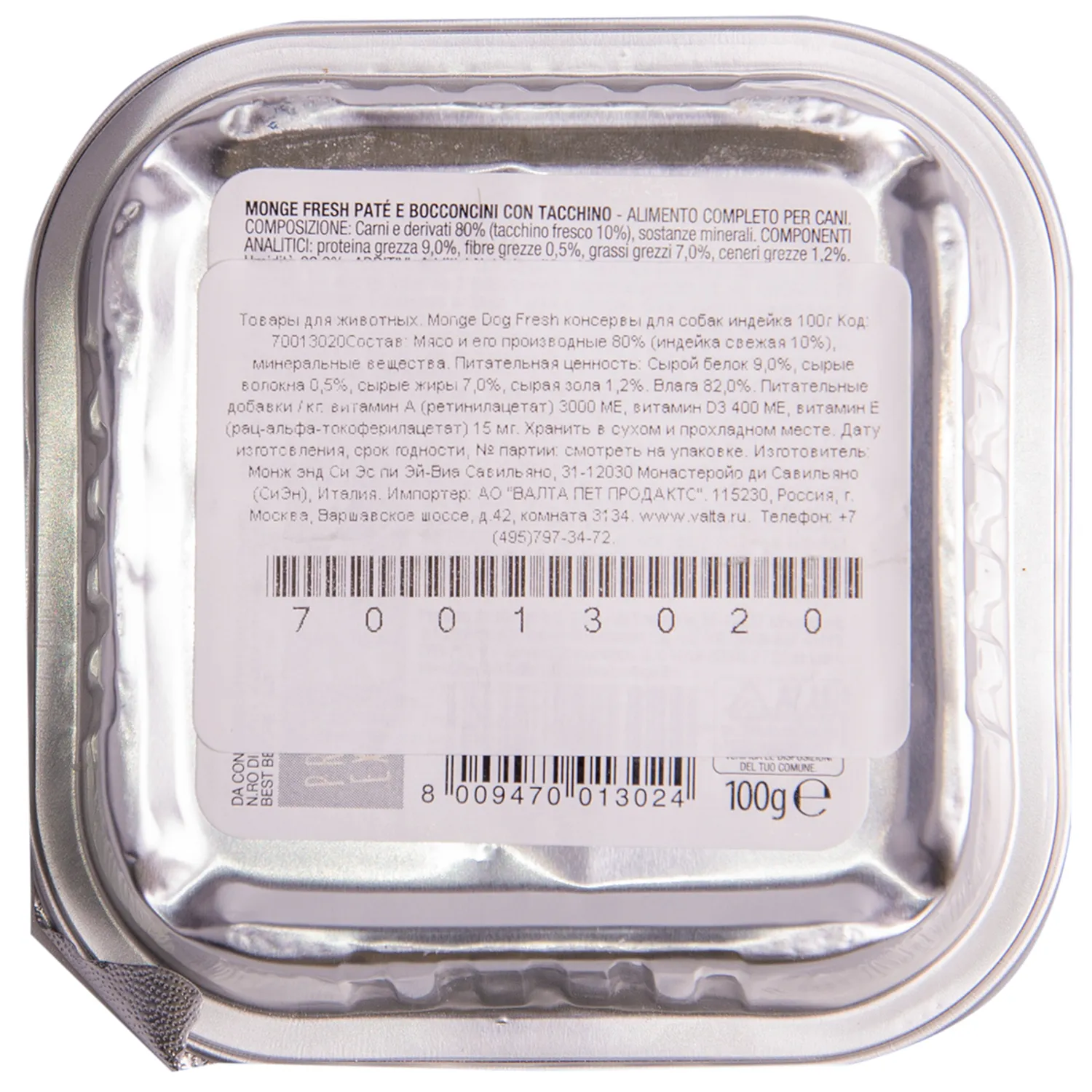 Влажный корм Monge Dog Fresh для собак, с индейкой, консервы 100 г