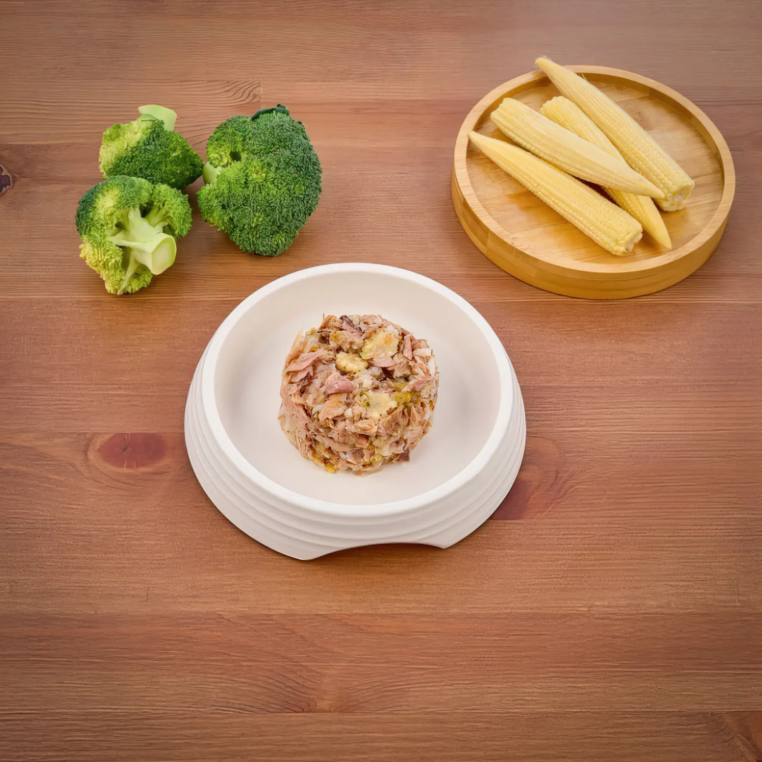 Тунец 50%, брокколи 4%, мини-кукуруза 4%, рис, очищенное подсолнечное масло, фруктоолигосахариды (ФОС) 0,04%.Питательная ценность: сырой белок 14%, сырая клетчатка 0,1%, сырой жир 2%, сырая зола 2%, влага 80%.