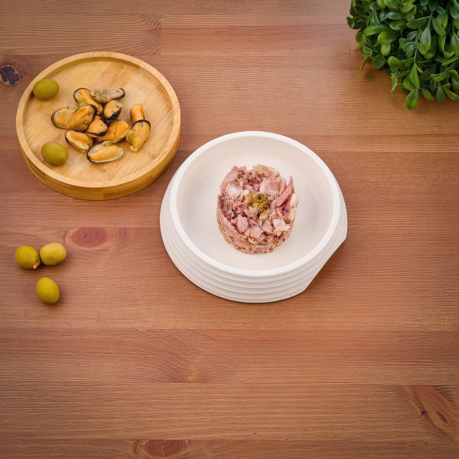 Тунец 50%, мидии 4%, оливки 4%, рис, очищенное подсолнечное масло, фруктоолигосахариды (ФОС) 0,04%