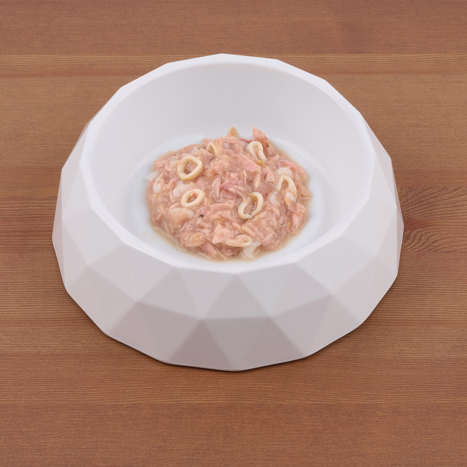 Тунец (Katsuwonus pelamis) 50%, кальмары (Loligo vulgaris) 5%, рис, тапиока, фруктоолигосахариды (F.O.S.) 0,04%.Питательная ценность:Сырой белок: 15,5%, сырая клетчатка: 0,1%, сырой жир: 1%, сырая зола: 1,5%, влага 80%.