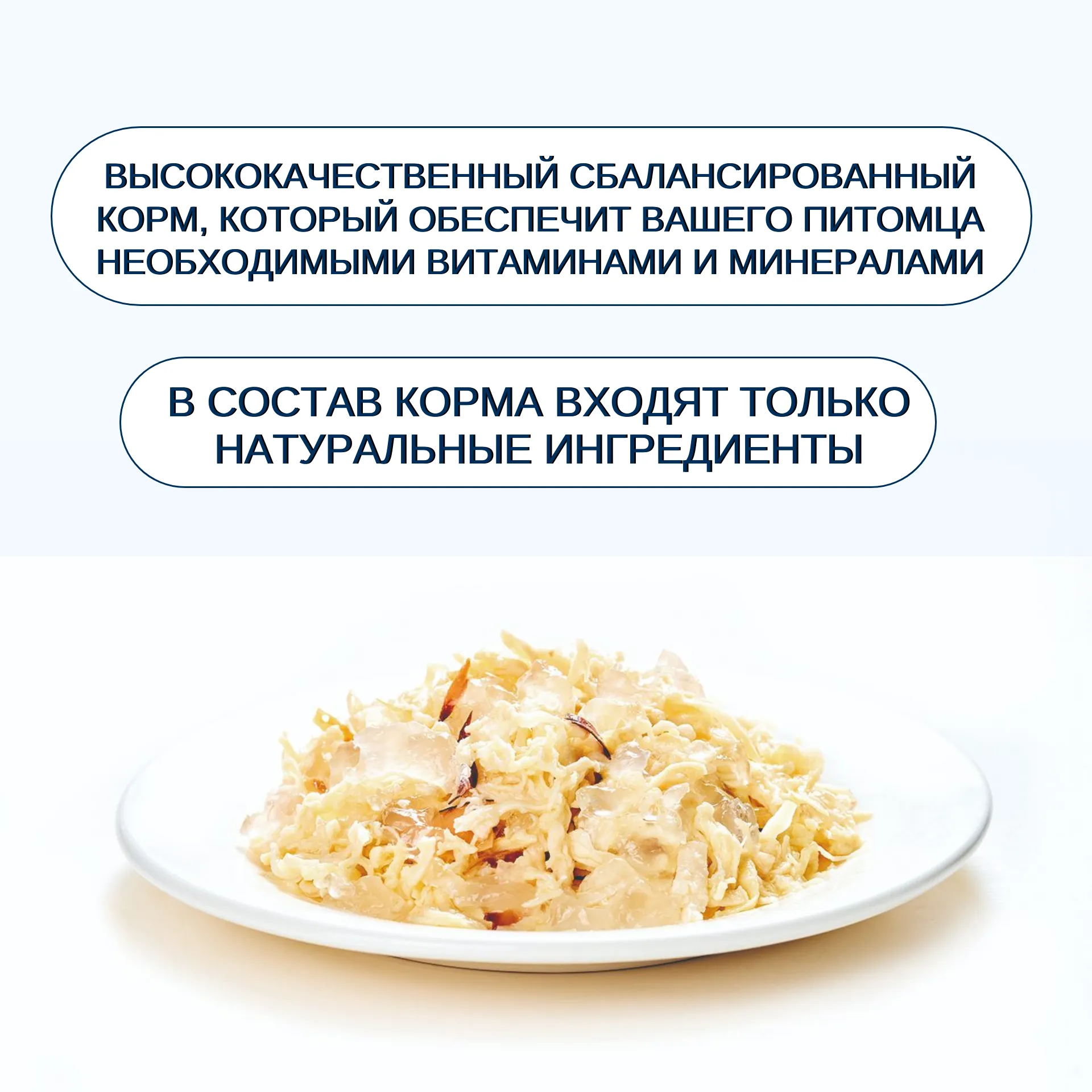 курица, тунец, крахмал, каррагинан, соль, скумбрия, таурин, экстракт чая, витамины (A, B2, B3, B5, D3, E), карбонат кальция Питательная ценность в 100 г (среднее значение): сырой белок 9%, сырой жир 0,1%, сырая клетчатка 0,5%, сырая зола 1,5%, влага 88%.Ингредиенты