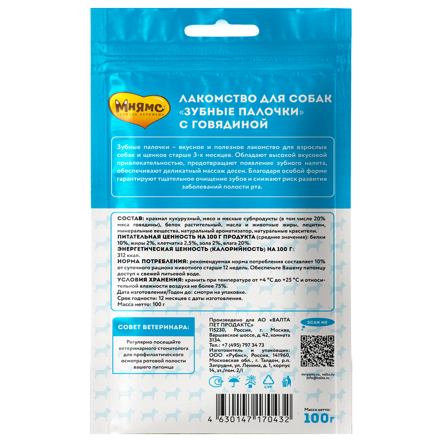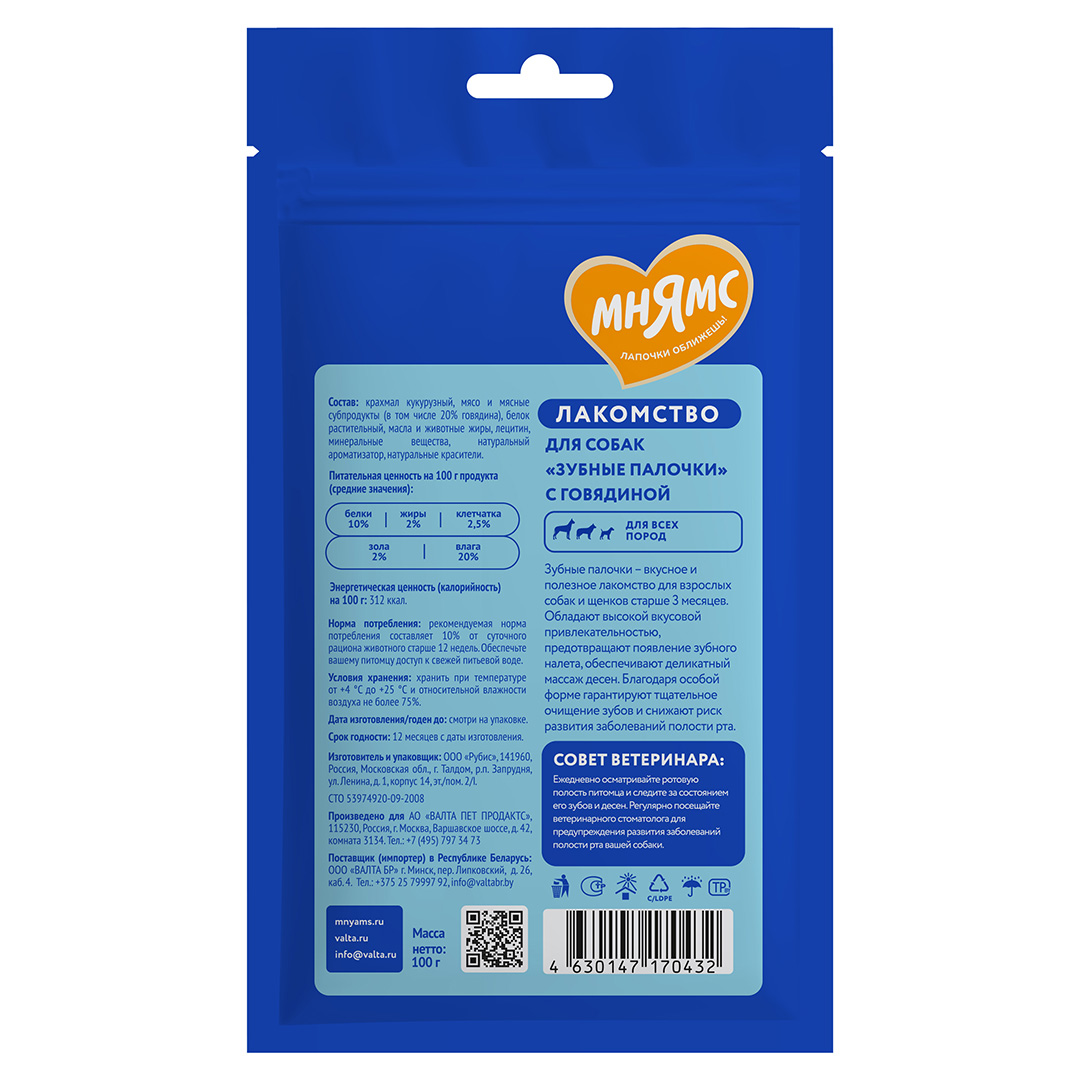 Мнямс ДЕНТАЛ "Зубные палочки" с говядиной – вкусное и полезное лакомство для взрослых собак и щенков старше 3-х месяцев. Обладают высокой вкусовой привлекательностью, предотвращают появление зубного налета, обеспечивают деликатный массаж десен. Благодаря особой форме гарантируют тщательное очищение зубов и снижают риск развития заболеваний полости рта.