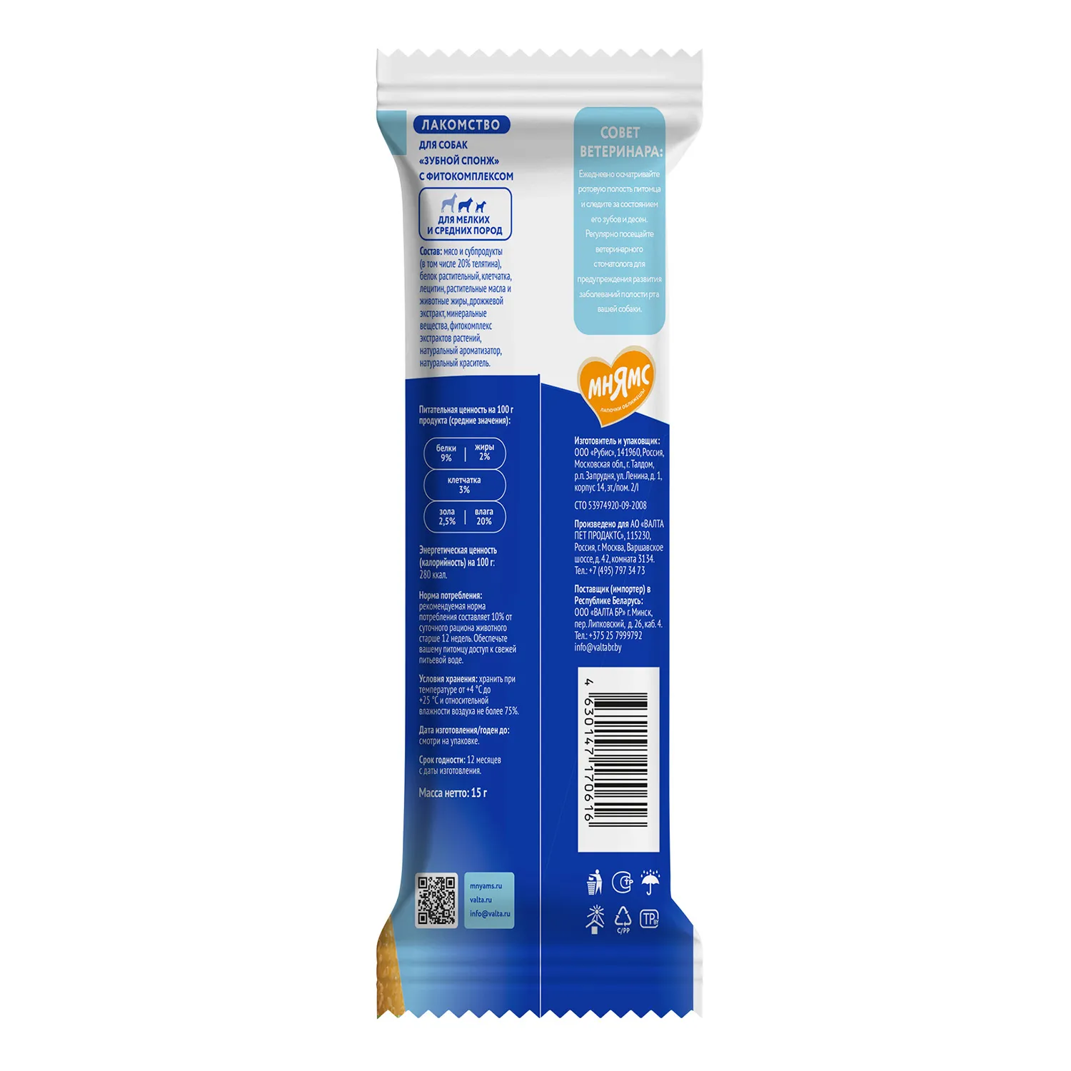 Мнямс ДЕНТАЛ "Зубные спонжи" – вкусное и полезное лакомство для взрослых собак и щенков старше 3-х месяцев. Благодаря специальной форме и структуре, спонжи позволяют эффективно и бережно очистить и отполировать зубную эмаль без применения зубной пасты, предотвращают появление зубного налета и камня, защищают от появления запаха из пасти и снижают риск развития заболеваний полости рта.