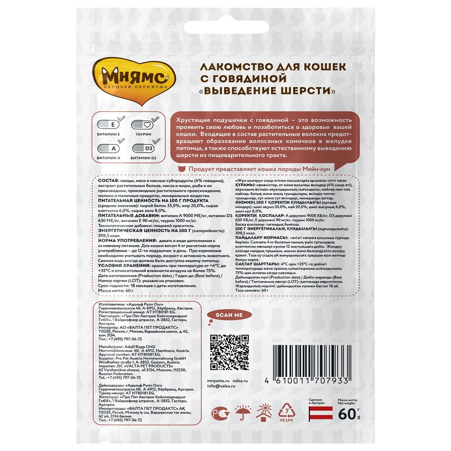 Лакомство Мнямс "Выведение шерсти" хрустящие подушечки для кошек с говядиной 60 г