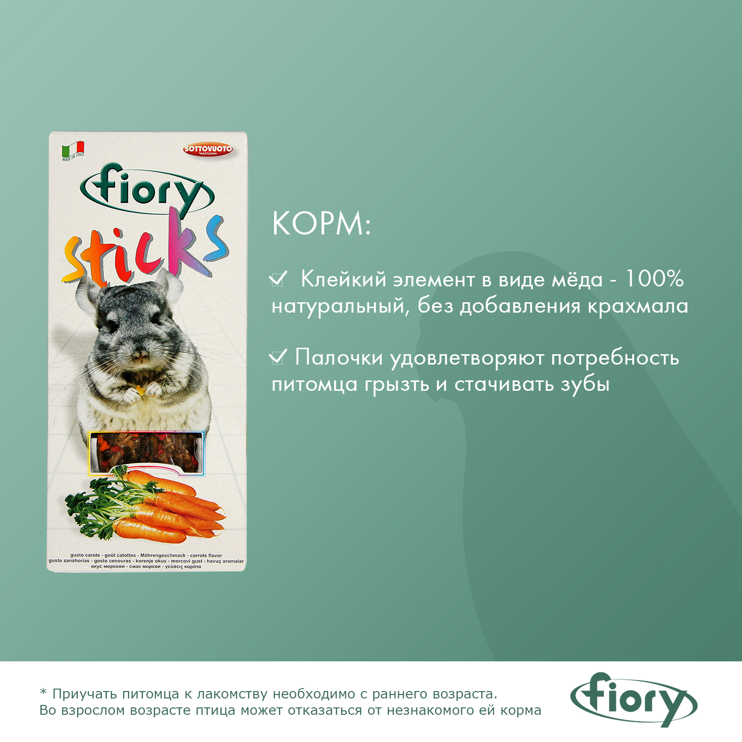 FIORY палочки для шиншилл с морковью. Лакомство для шиншилл должно быть особым. В состав палочек входят высушенные хлопья вкусной моркови, различные виды полезных семян, а также другие элементы, делающие лакомство отличным дополнением к рациону вашего маленького питомца.