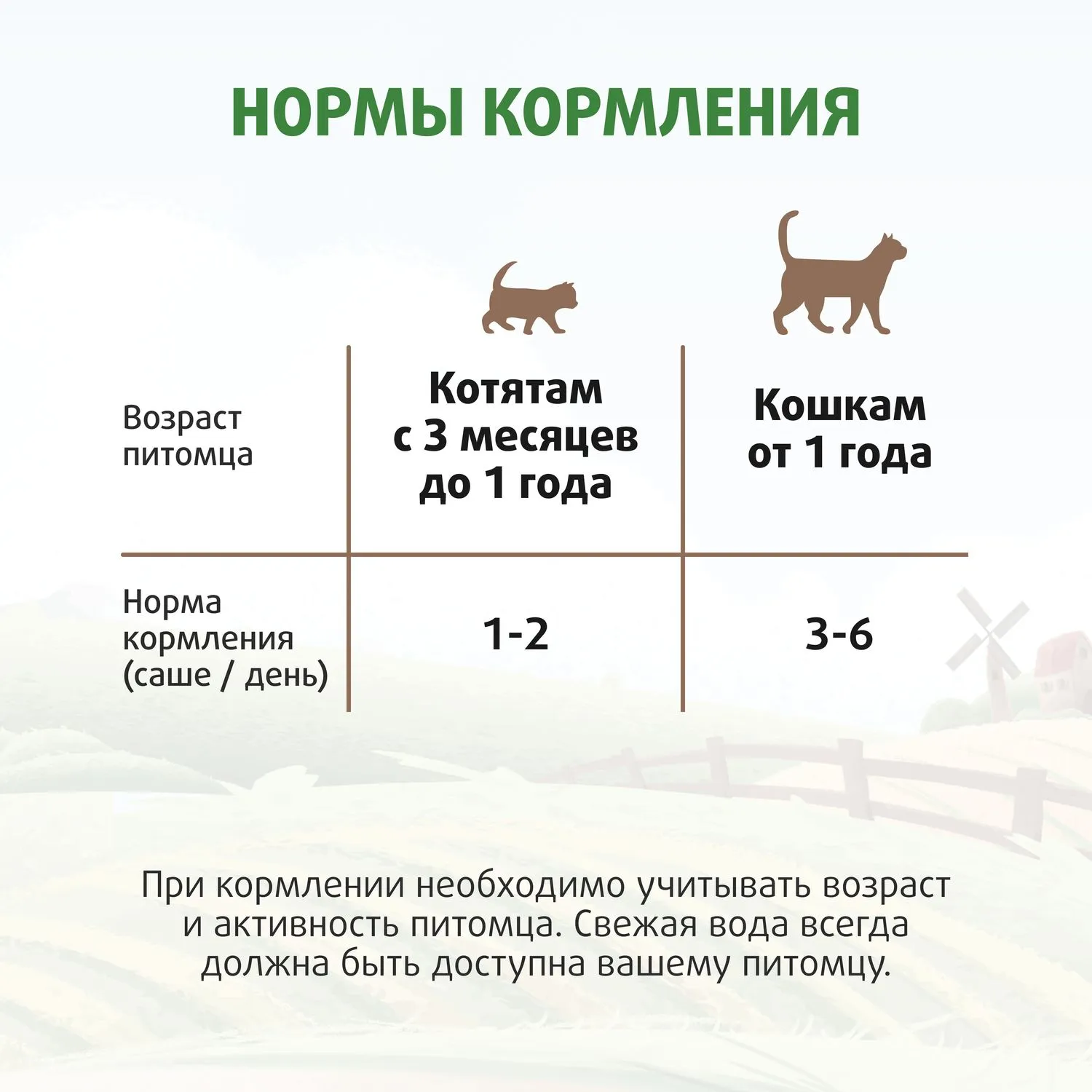 Норма потребления: котятам с 3 месяцев давать 1-2 саше в день, взрослым кошкам - 3-6 саше в день (в зависимости от размера и активности кошки). Свежая вода всегда должна быть доступна вашему питомцу.