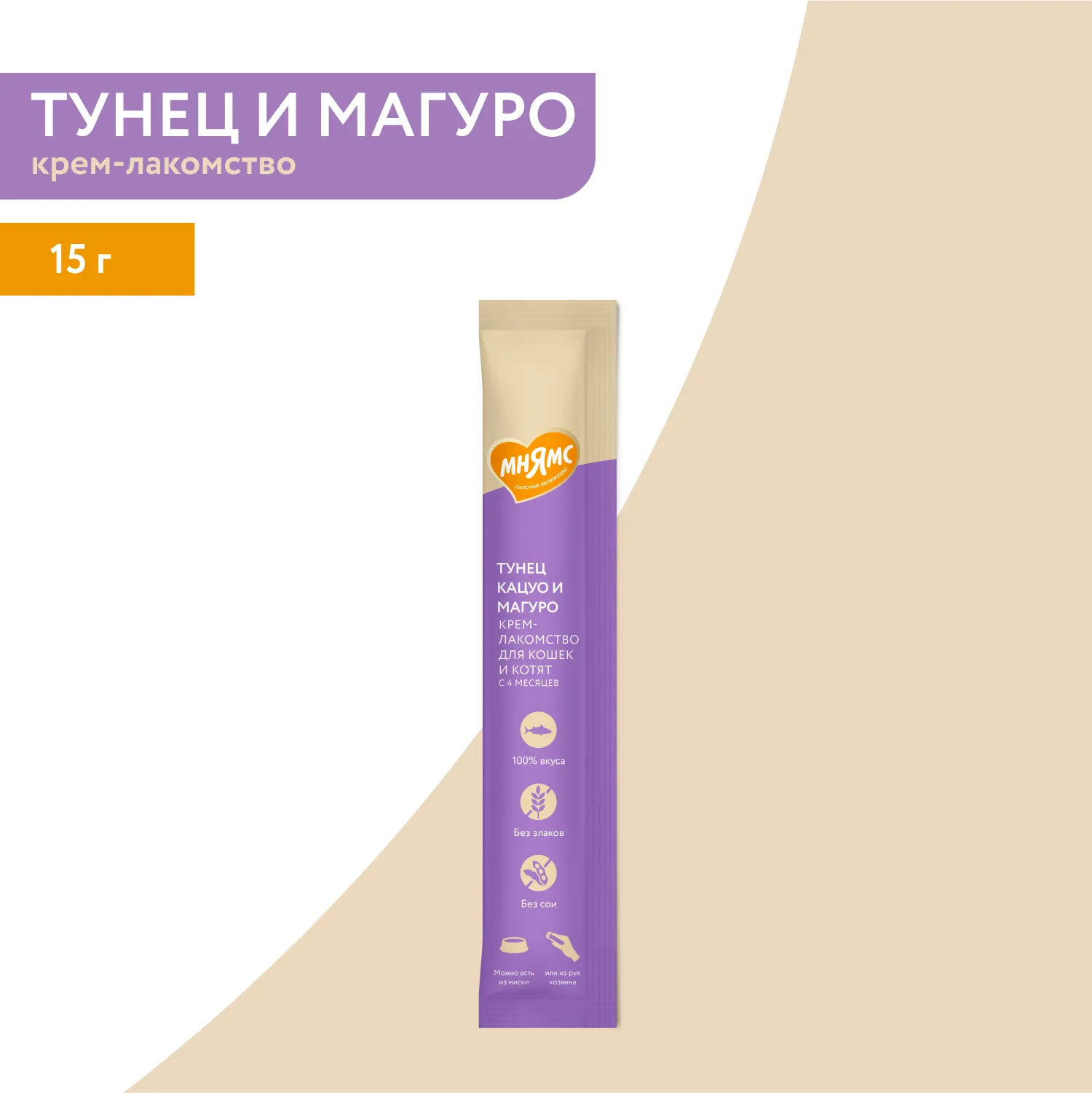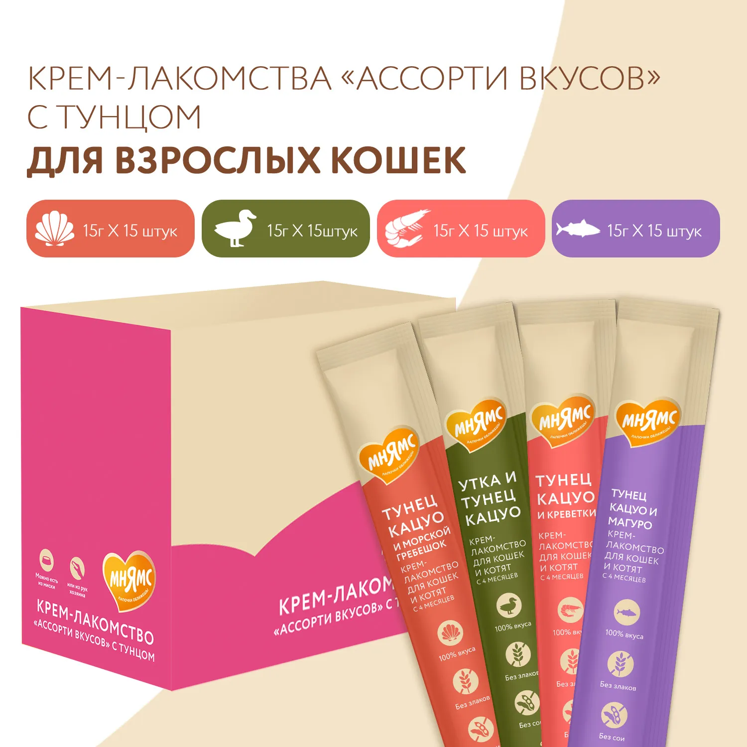 Крем-лакомство Мнямс для кошек и котят с 4 месяцев "Ассорти вкусов" с тунцом 15 г х 60 шт.