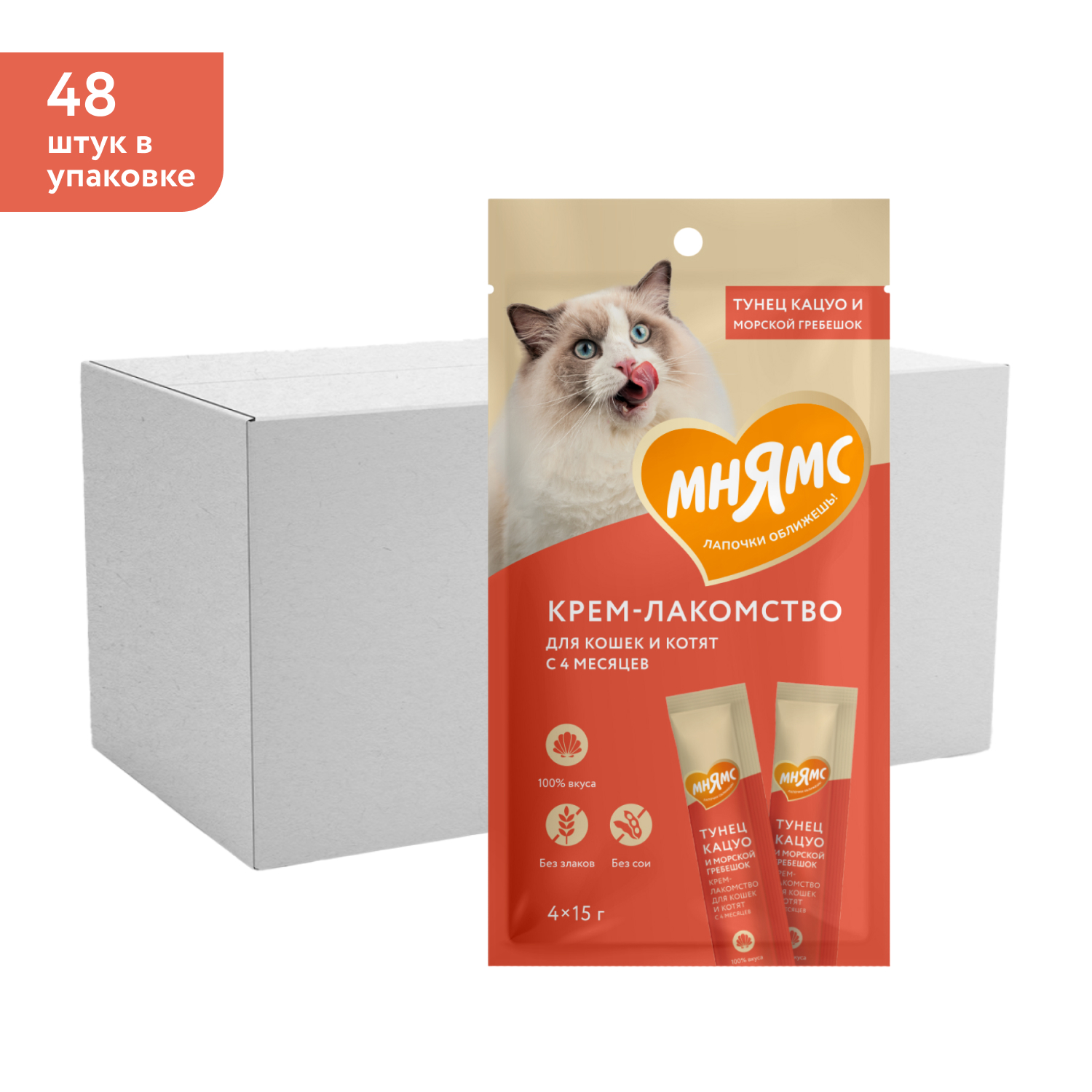 Крем-лакомство Мнямс для кошек с тунцом Кацуо и морским гребешком 15 г х 4 шт.