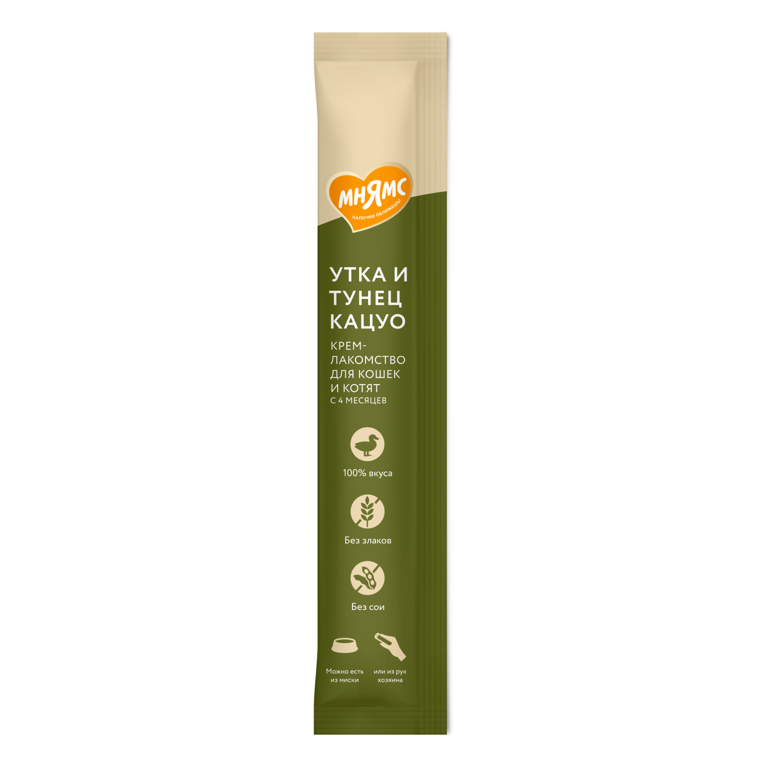 Крем-лакомство «Мнямс» с уткой и тунцом "Кацуо" – это излюбленное кошками угощение с нежнейшей кремовой текстурой.