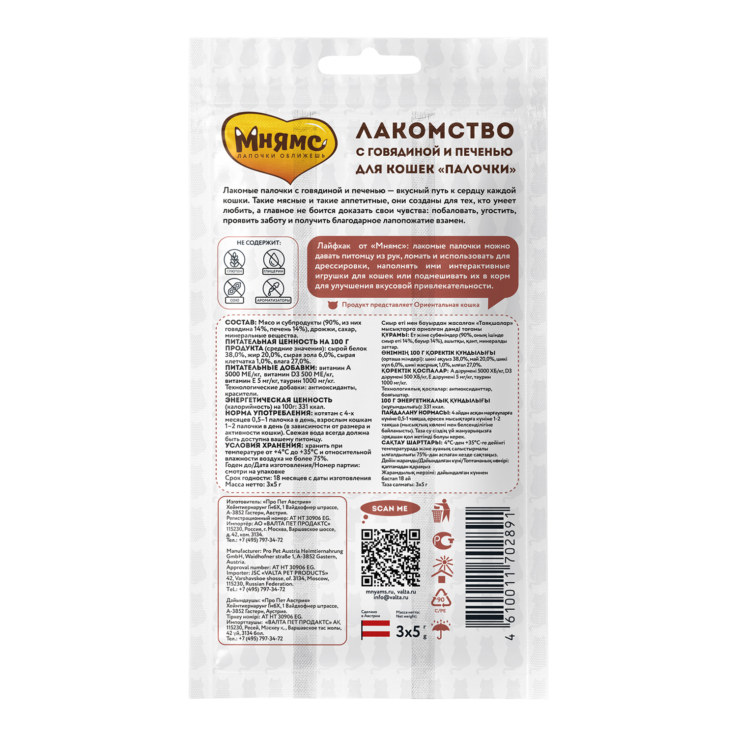 Мнямс лакомые палочки с говядиной и печенью – отличный выбор для вашей кошки. Мягкие палочки изготовлены из высококачественного натурального сырья и подходят для кормления котят с 4-х месяцев.