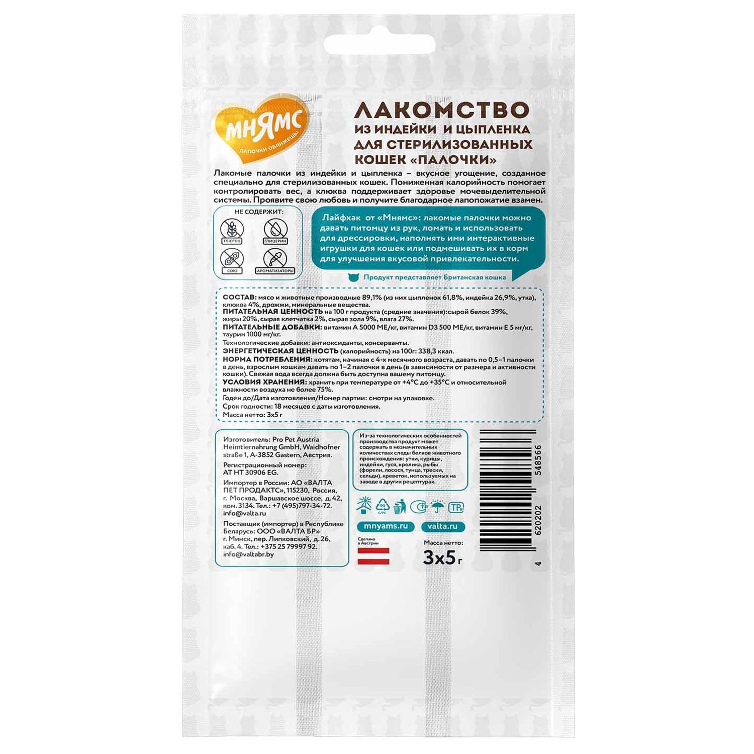 Лакомство Мнямс лакомые палочки для стерилизованных кошек из индейки и цыпленка 3х5 г