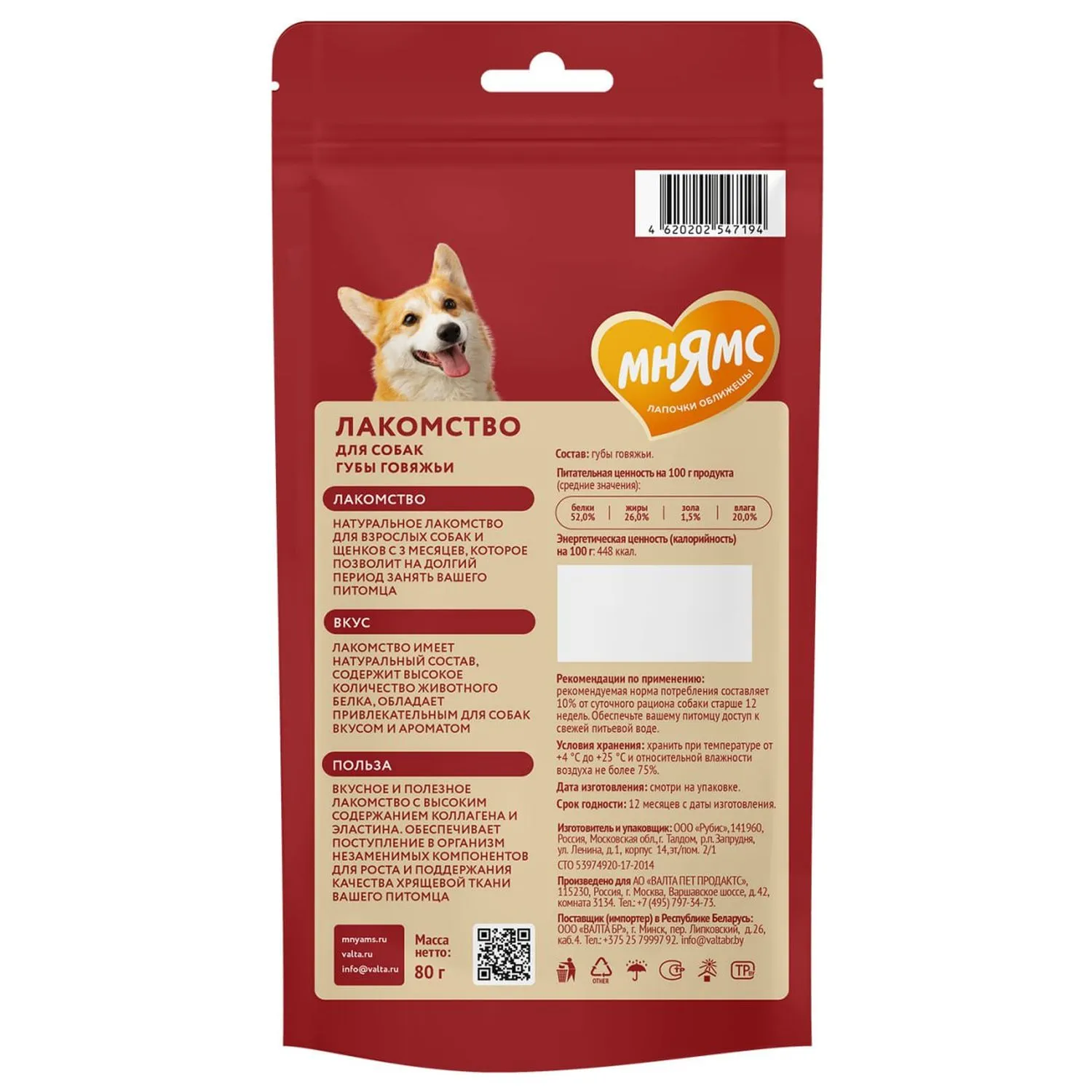 Состав: губы говяжьи.Питательная ценность (средние значения) на 100 г: белки 52%, жиры 26%, зола 1,5%, влага 20%.