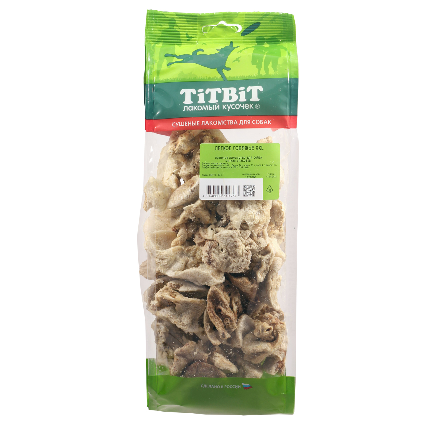 Кусочки высушенного говяжьего легкого. Высокое содержание микроэлементов и соединительной ткани дополняет удовольствие собаки от нежного лакомства. Легкие очень вкусны, малокалорийны и замечательно усваиваются организмом. Легкие содержат практически такой же набор витаминов, как и мясо, но зато гораздо менее жирные. Оказывают положительное воздействие на состояние кожи, шерсти и общий обмен веществ. Кусочки очень удобно использовать в качестве поощрения при дрессуре, и просто на прогулках. Для собак всех пород и возрастов. Особенно рекомендуется для собак с неполной зубной формулой и возрастными изменениями зубочелюстного аппарата. Благодаря вкусовым качествам и воздушной структуре является одним из самых любимых лакомств для наших четвероногих друзей.