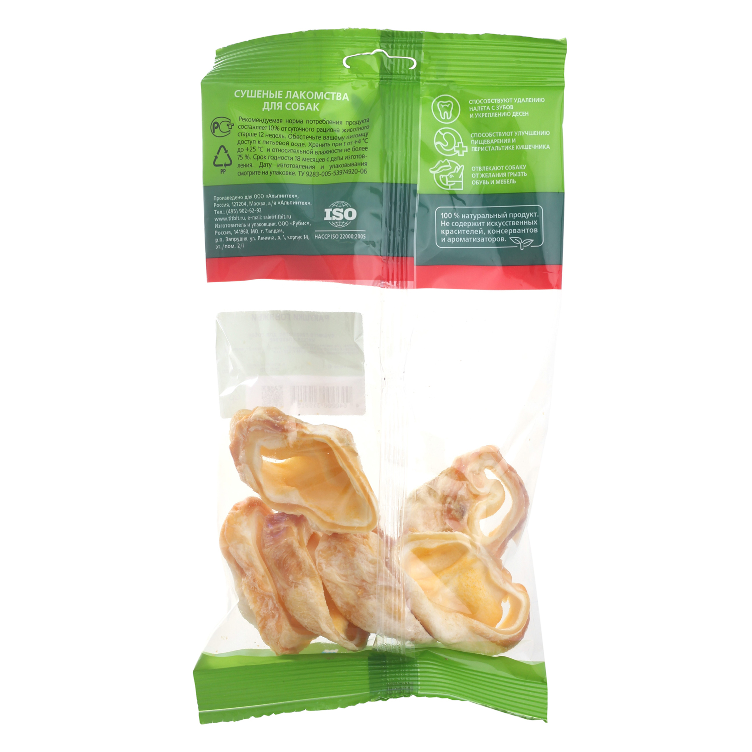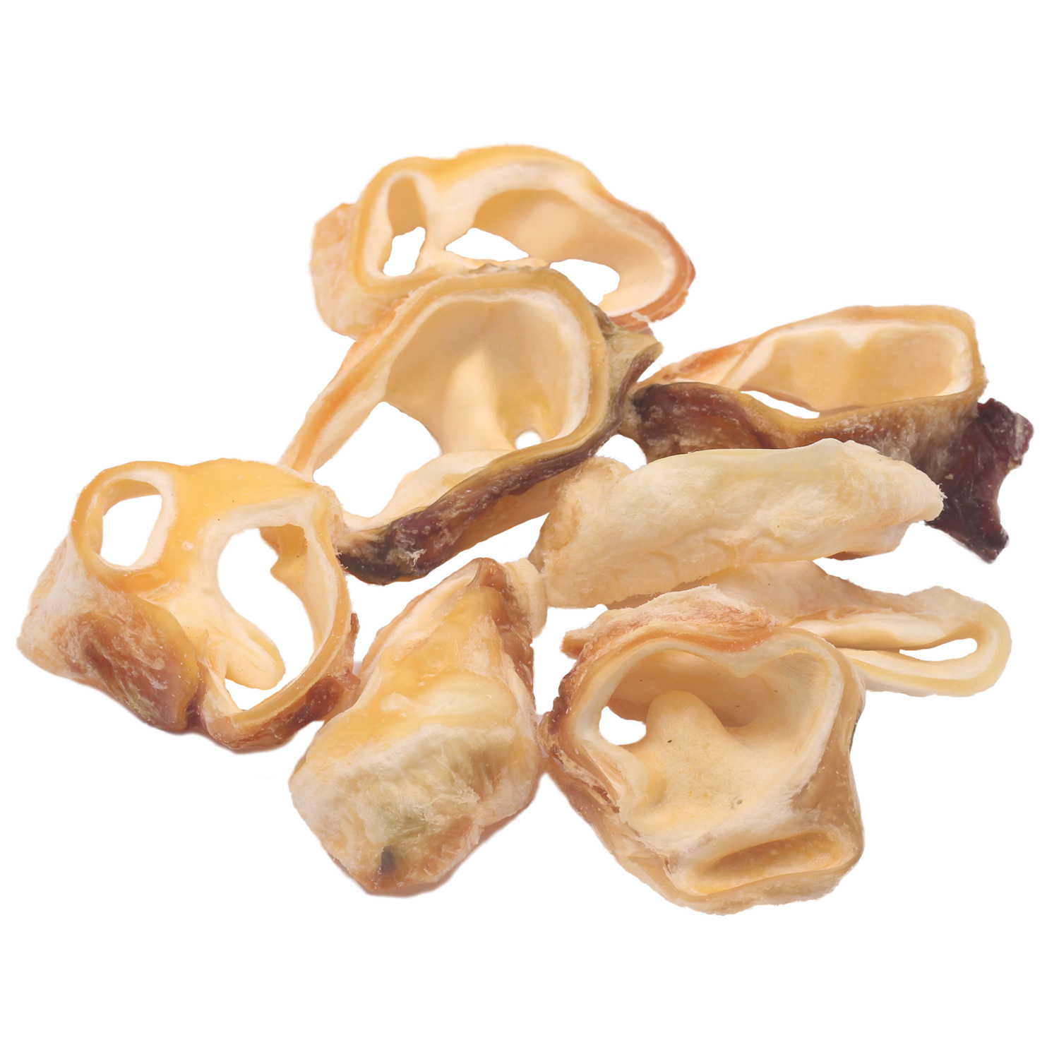 Упаковка содержит высушенные хрящевые основания говяжьих ушей. Высокое содержание коллагеновых и эластиновых волокон обеспечивает поступление в организм незаменимых компонентов для роста и поддержания качества хрящевой ткани суставов Вашего питомца. Рекомендовано с целью облегчения смены зубов у щенков, укрепления десен, очистки зубов от пищевого налета и зубного камня, дополнительного питания и укрепления хрящевой ткани собак среднего и старшего возраста. Высокое содержание коллагена и эластина способствует улучшению формирования ушного хряща для пород собак, стандартом которых предусмотрен вертикальный постав ушной раковины.