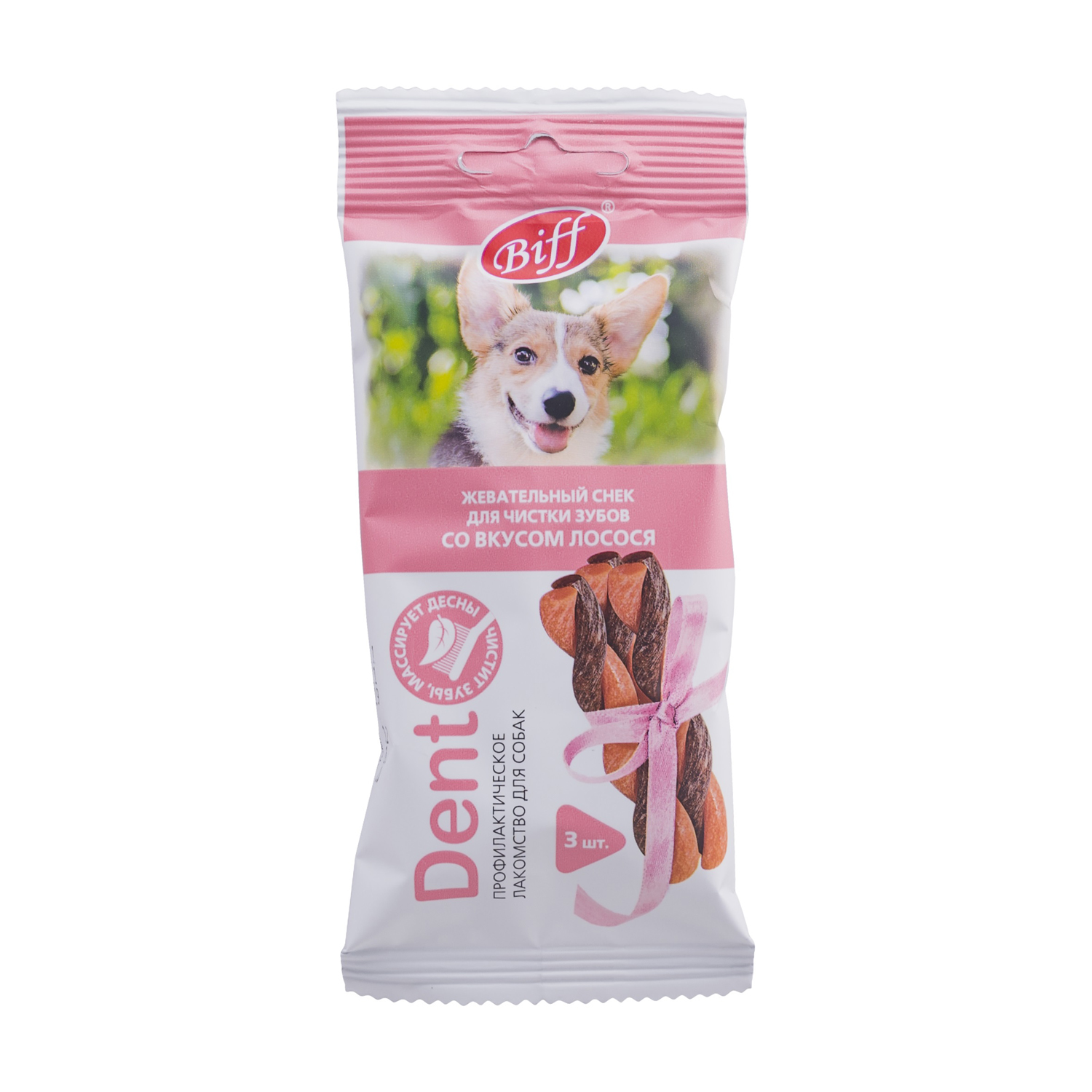 Biff «DENT» со вкусом лосося – это жевательный снек для собак, необходимый для снятия мягкого зубного налёта, снижения уровня зубного камня и массажа дёсен за счет специально разработанной формы и текстуры, используется в качестве лакомства и поощрения. Рекомендуется для собак мелких пород.