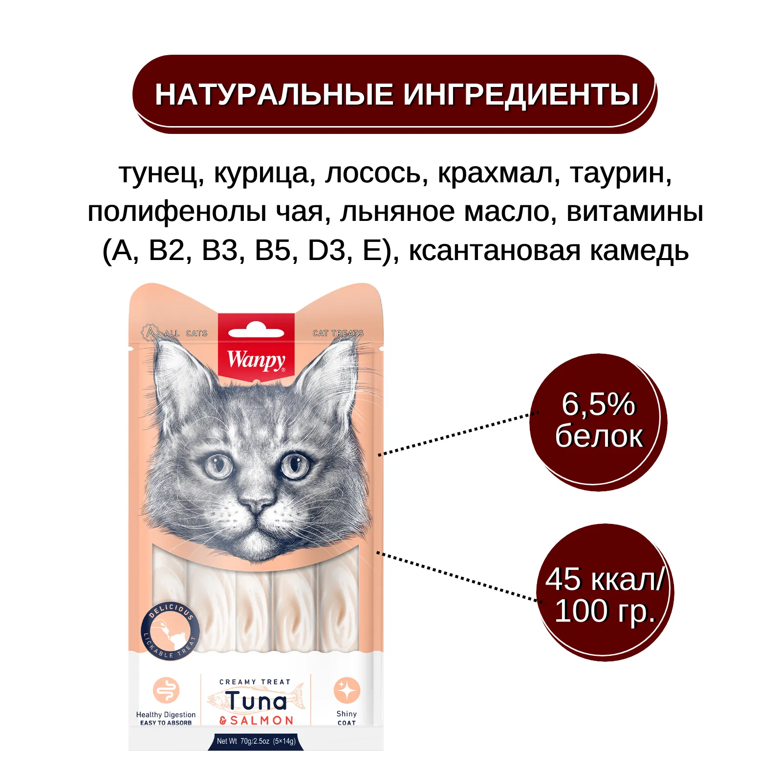 Среднее содержание сырого белка в 100 г лакомства составляет 6,5%, что делает его идеальным для ежедневного угощения кошек любых пород и возрастов.