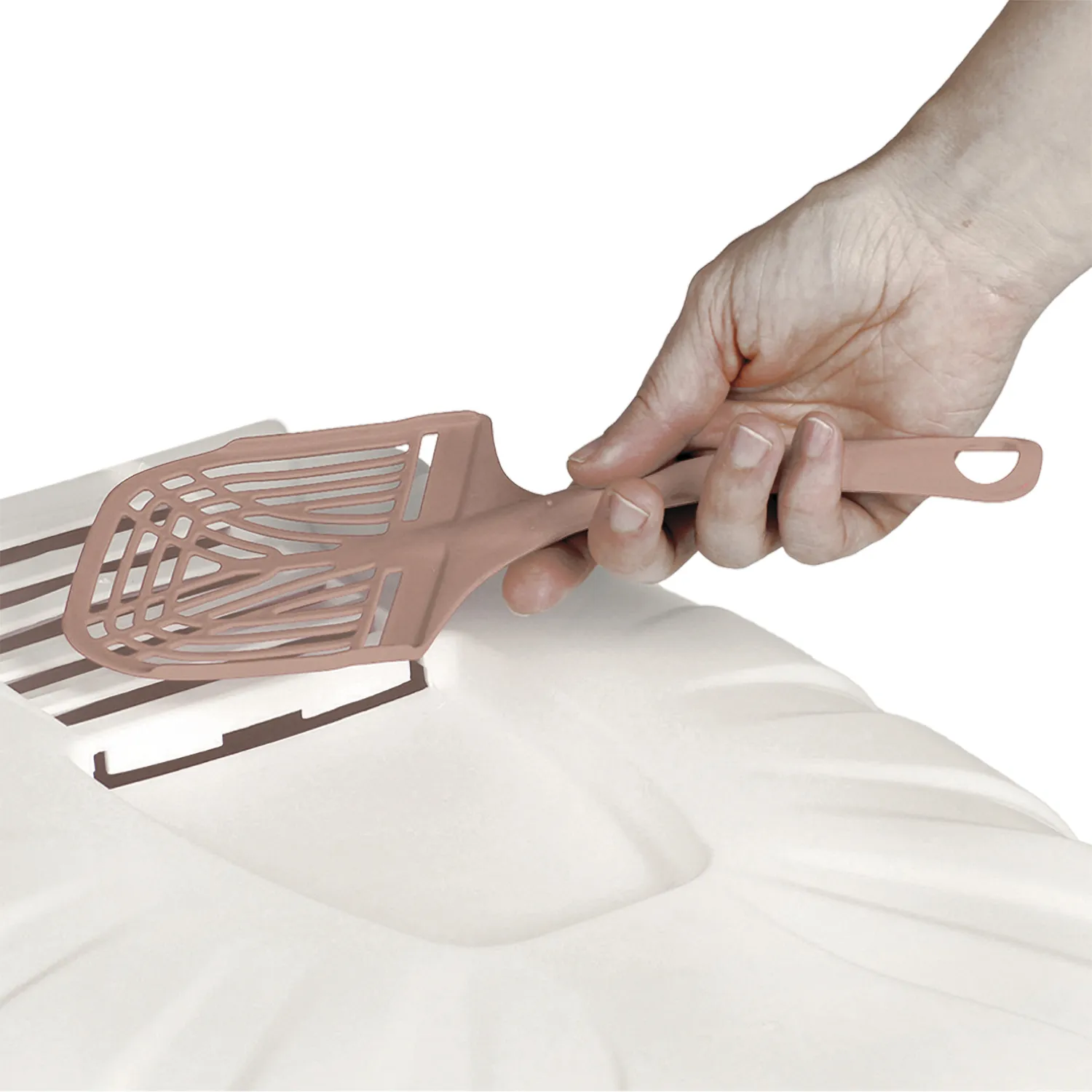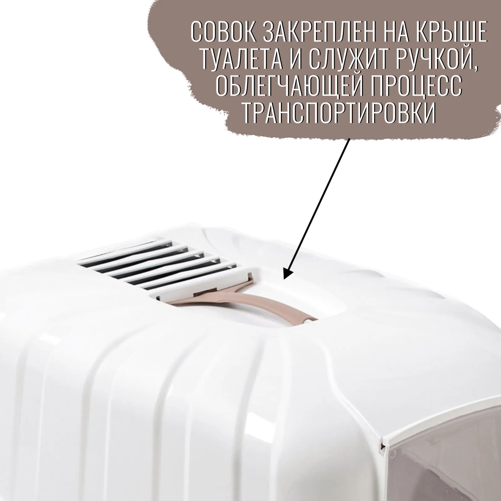 В отличие от обычных лотков био-туалет KOMODA имеет специальный фильтр, который быстро нейтрализует неприятные запахи, дверцу, через которую питомец легко попадает внутрь, а также совок для уборки. Совок закреплен на крыше туалета и служит ручкой, облегчающей процесс транспортировки.