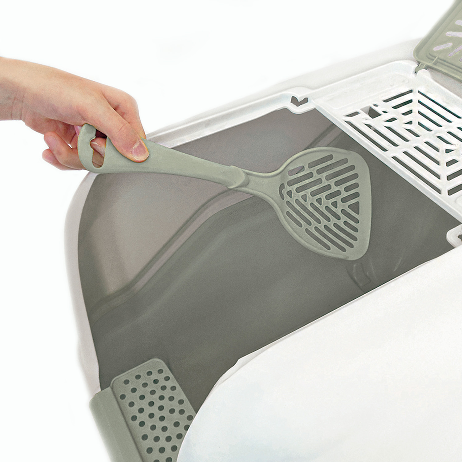 В отличие от обычных лотков био-туалет Netta имеет специальный фильтр, который быстро нейтрализует неприятные запахи, дверцу, через которую питомец легко попадает внутрь, а также совок для уборки. Совок удобно закреплен на внутренней стороне крыши туалета. Удобный отсек на крыше туалета позволяет легко проводить его уборку, а перфорированная ступенька уменьшает разбрасывание наполнителя. Наличие ручки облегчает процесс транспортировки.