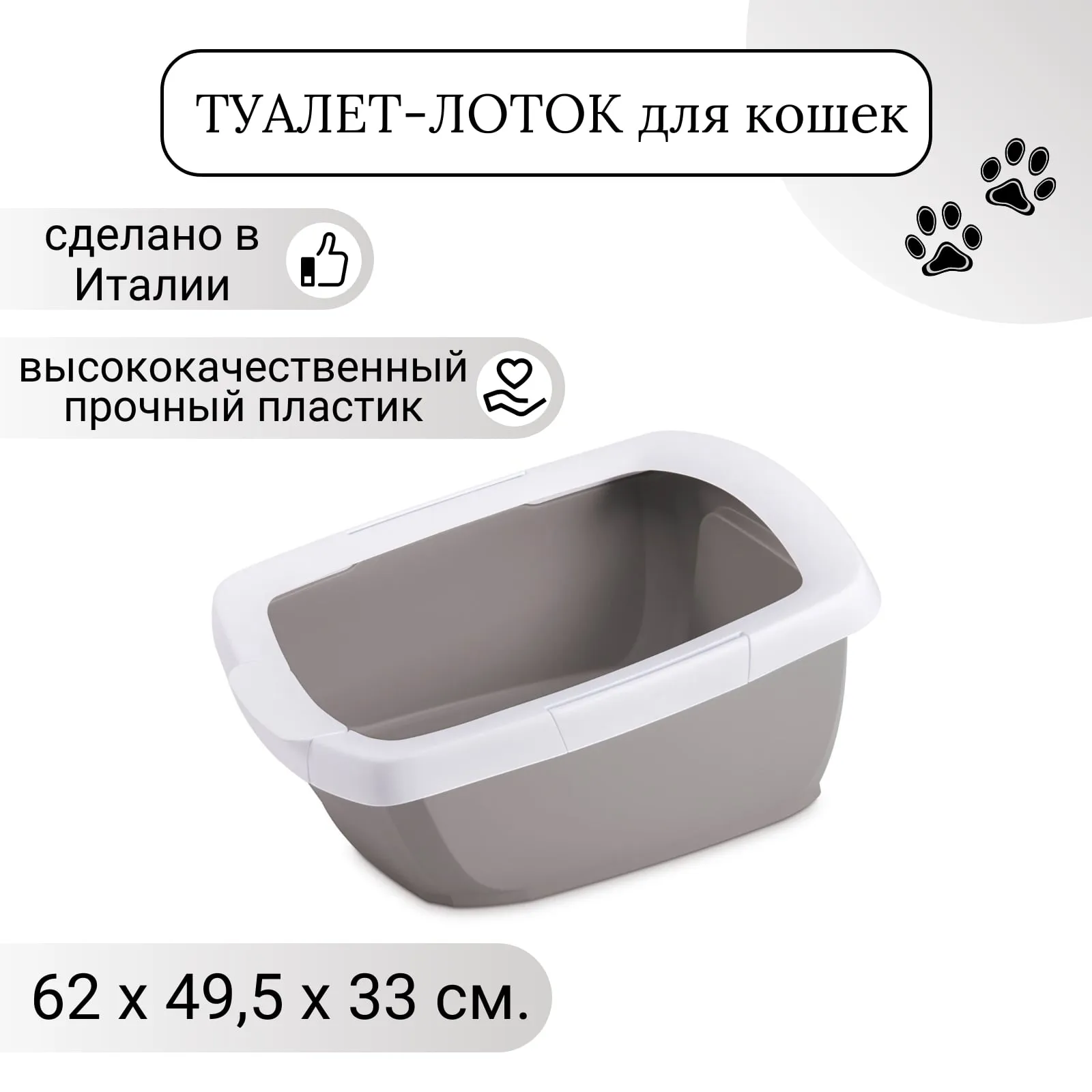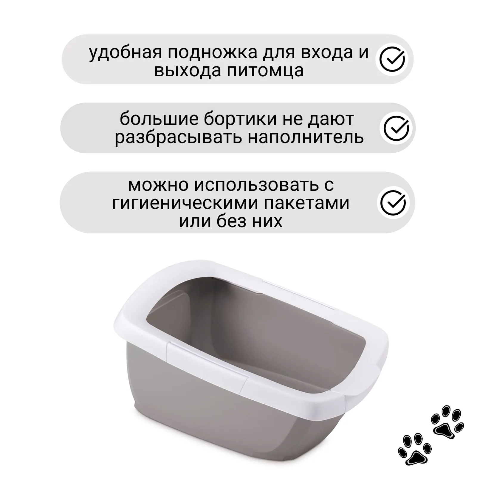 Открытый туалет для кошек крупных пород. Оборудован удобной подножкой для входа и выхода питомца. Возможно использовать с гигиеническими пакетами или без них.