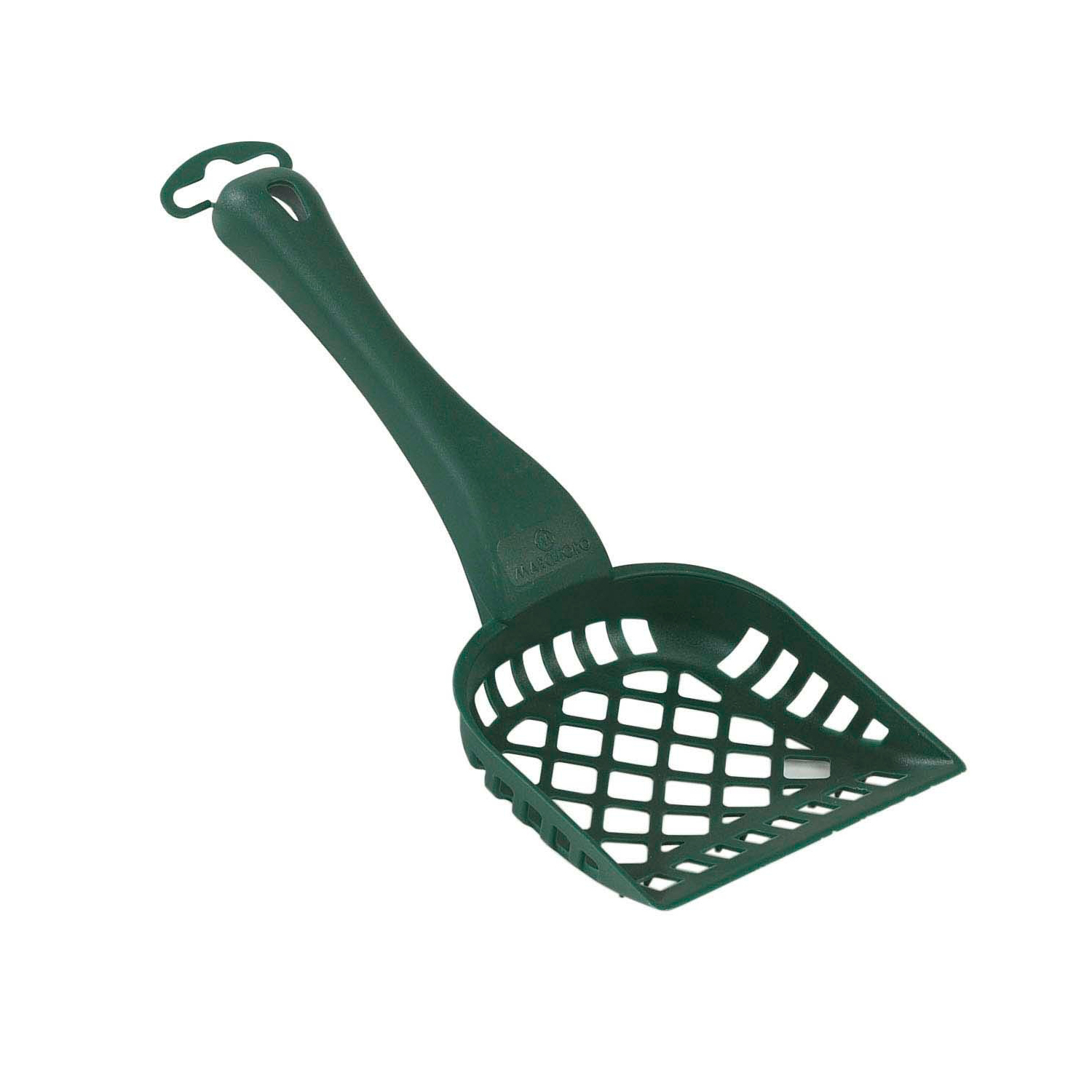 Удобный совочек с крупными отверстиями применяется очистки кошачьего туалета, на рукоятке находится специальная петелька.