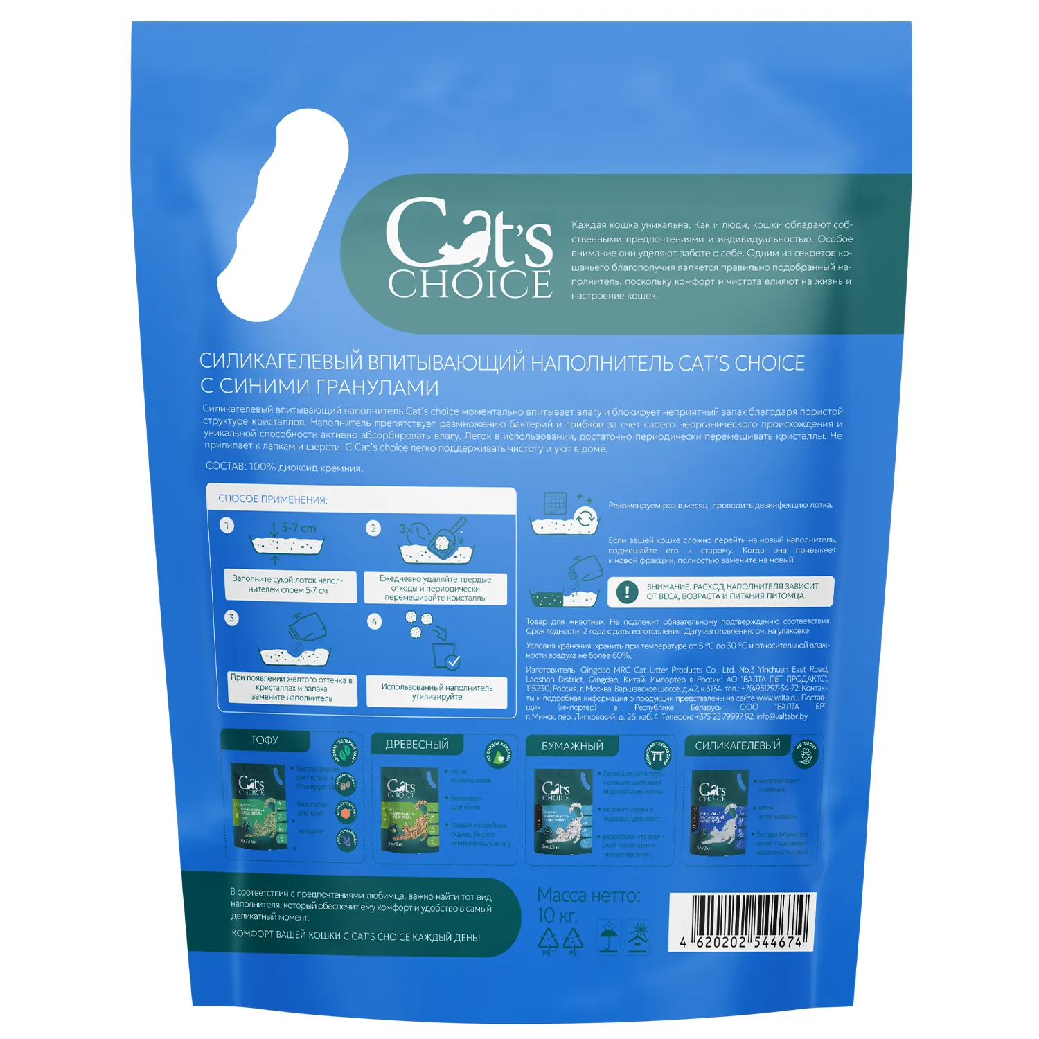 Силикагелевый впитывающий наполнитель Cat's choice с синими гранулами 10 л/4 кг