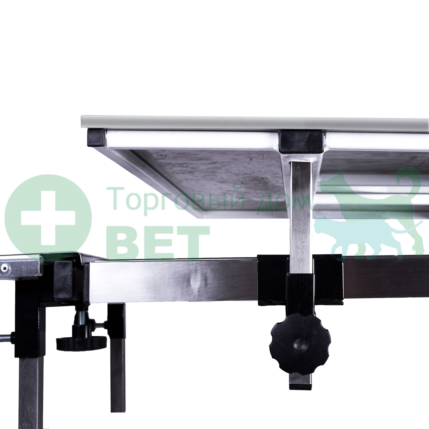Стол также оснащен дополнительной съемной столешницей из нержавеющей стали, рейлингами, фиксаторами, анестезиологической дугой и штативом для вливаний для удобной и оперативной работы ветеринарного хирурга. Дополнительная съемная столешница позволяет увеличить площадь стола. Дополнительную столешницу можно закрепить в любом месте по периметру стола.