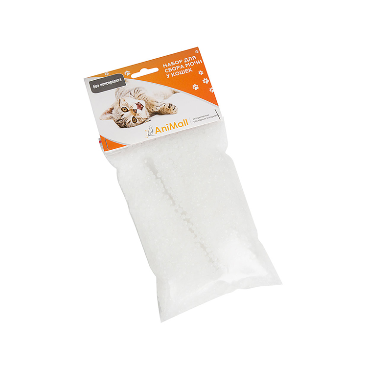 Набор для сбора мочи у кошек включает в себя пробирку с пипеткой и гранулы, не впитывающие влагу. Пробирка без консерванта, анализы необходимо привезти в лабораторию в течение 3–5 часов после сбора.
