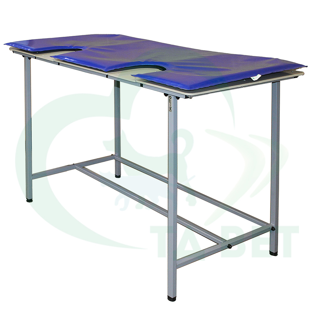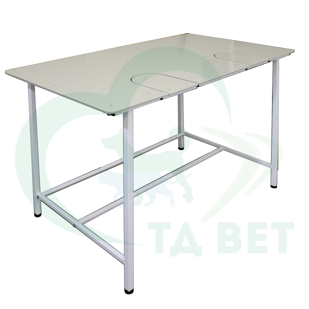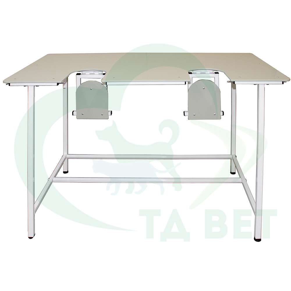 Ветеринарный стол СВУ-29.2 с опускающимися створками в столешнице может использоваться как для осмотра, так и для проведения УЗИ и ЭХО процедур.
